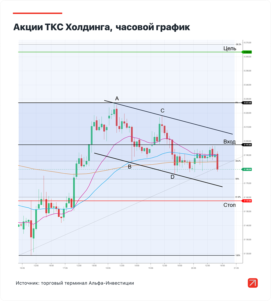 Мнение: Альфа-Инвестиции Технический анализ акций: подтверждение роста после четырёх сессий закрытия выше EMA Торговый план • Покупка (лонг): акции ТКС Холдинга по цене 3197,6 руб. • Срок: 1 неделя • Цель: 3263,4 руб. за акцию • Потенциальная доходность: до 2% Почему акции могут вырасти? На дневном графике сформировался технический паттерн, который указывает на продолжение восходящего тренда. Индикаторы EMA (20- и 50-дневные) показывают рост, что говорит о том, что акция находится в среднесрочном восходящем тренде. Цена бумаги закрывается выше индикаторов уже четыре сессии подряд, что подтверждает уверенность в продолжении роста. На часовом графике можно более детально рассмотреть техническую фигуру продолжения тенденции «Флаг». После импульса от 16 июня были сформированы все четыре точки построения ABCD. Точка входа В качестве стандартной точки входа можно использовать закрепление цены выше 20- и 50-часовой экспоненциальных скользящих средних (EMA) на уровне 3197,6 рубля. Эта цена выше текущей, и для завершения технического паттерна её необходимо дождаться, прежде чем совершать сделку. Это увеличит вероятность продолжения роста. Цель При достижении уровня точки A (значение 3227,4 рубля) необходимо перенести стоп в безубыток с учётом комиссии. При достижении цели 3263,4 рубля следует продать всю позицию. Не стоит забывать о рисках Идея основана на техническом анализе, поэтому для ограничения потенциальных убытков рекомендуется разместить защитную стоп-заявку на уровне 3157,6 рубля. Ориентируйтесь на расположение уровня отката Фибоначчи для всего импульса — 61,8%. Если бумага уйдёт ниже этого уровня, то с высокой вероятностью произойдёт глубокая коррекция, и идея не сработает. Источник: alfabank.ru Автор: Житник Роман В этом сообщении представлено мнение экспертов инвестиционной компании или банка. Оно предоставляется исключительно для ознакомления и не является рекомендацией для покупки или продажи ценных бумаг, а также для принятия каких-либо коммерческих или других решений. Mondiara.com не несёт ответственности за содержание этого сообщения и последствия его использования.