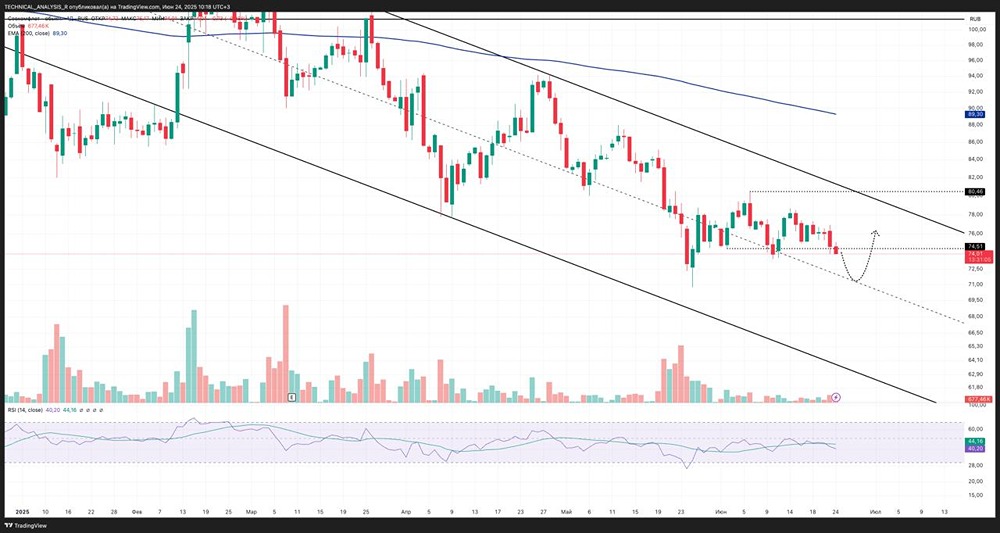 Размышления о «Совкомфлоте» ⚓️$FLOT ТФ-1Д Цена держится выше середины нисходящего тренда. Именно отсюда акции дважды разворачивались за последние месяцы. RSI опустился до 40: продавцы выдохлись, но до перепроданности ещё есть путь, так что небольшой откат к 72-73 возможен. Если отскок произойдёт по привычному сценарию, первой целью будет 76–77 (+3 %). Пробой внутренней пунктирной линии откроет путь к 80,5 (+8 % от текущих). Сверху по-прежнему давит EMA-200 (89), до её полноценного теста бумаге нужно вырасти примерно на 18 %, что пока кажется маловероятным. Основная идея остаётся прежней: ловим откат к 72-73 и открываем позицию на разворот с коротким стоп-лоссом под нижней пунктирной линией. Пока цена находится внутри канала, потенциал роста ограничен его верхней границей. Рынок явно не поощряет агрессивных «лонгов надолго». Данный материал носит информационный характер и не является индивидуальной инвестиционной рекомендацией или предложением о покупке или продаже указанной ценной бумаги. Источник: Капибара на Бирже
