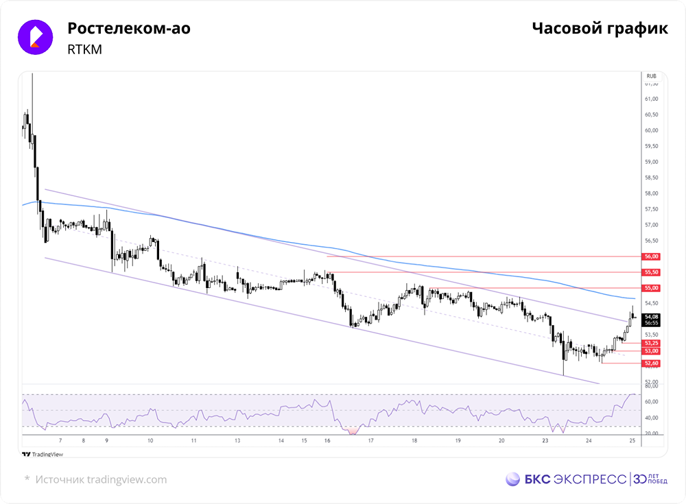 Мнение: БКС Экспресс Снова началась борьба за отметку 54. Вчера обыкновенные акции Ростелекома подорожали на 2,1%, достигнув отметки в 54,02 рубля. Объём торгов составил 0,2 миллиарда рублей. На утренней сессии стоимость акций снизилась на 0,04%, до 54 рублей. Краткосрочный анализ Значительное повышение стоимости акций сопровождалось средним торговым оборотом. После сопоставимого падения стоимости днём ранее, акции продемонстрировали рост. Это указывает на то, что среднесрочный нисходящий тренд, который наблюдался ранее, был сломлен. Кроме того, акции вернулись к важному уровню в 54 рубля, который ранее выступал в качестве поддержки. Информационным поводом для снижения и последующего роста стоимости акций в начале текущей недели стало объявление компанией дивидендов за 2024 год. Дивидендная доходность обыкновенных акций за год составит 5%, что ниже показателя в 11,2% для привилегированных акций. Таким образом, обыкновенные акции стали менее привлекательными до момента отсечки, которая состоится 13 августа. Закрытие торгов произошло ниже 200-часовой скользящей средней цены, но по итогам дня сложилась позитивная краткосрочная техническая картина. Высокое утреннее значение индикатора относительной силы (RSI) на часовом графике указывает на близость к состоянию перекупленности. После разнонаправленного движения в течение двух дней, обыкновенные акции Ростелекома могут стабилизироваться около текущего уровня. Это может привести к возобновлению борьбы за закрепление выше или ниже важного уровня в 54 рубля. Внешний фон Индекс S&P 500 вчера снизился на 1,11%. Фьючерсы на S&P 500 утром демонстрируют рост на 0,1%. Азиатские фондовые индексы в основном растут. Цена на нефть Brent увеличилась на 1,6%, достигнув отметки в 68,2 доллара за баррель. Уровни сопротивления: 55, 55,5, 56. Уровни поддержки: 53,25, 53, 52,6. Долгосрочный анализ Обыкновенные акции Ростелекома долгое время не показывали значительного роста стоимости и сейчас торгуются на уровне 2000 рублей. Это отчасти объясняется тем, что бумаги относятся к дивидендным. С середины апреля акции торгуются значительно ниже 200-дневной скользящей средней цены, но долгосрочная техническая картина пока остаётся нейтральной. Прогноз по цене обыкновенных акций Ростелекома на горизонте года составляет 72 рубля. Это предполагает потенциальный рост стоимости в пределах 33% от текущего уровня. Источник: bcs-express.ru Автор: Манжос Виталий Не является индивидуальной инвестиционной рекомендацией В этом сообщении представлено мнение экспертов инвестиционной компании или банка. Оно предоставляется исключительно для ознакомления и не является рекомендацией для покупки или продажи ценных бумаг, а также для принятия каких-либо коммерческих или других решений. Mondiara.com не несёт ответственности за содержание этого сообщения и последствия его использования.
