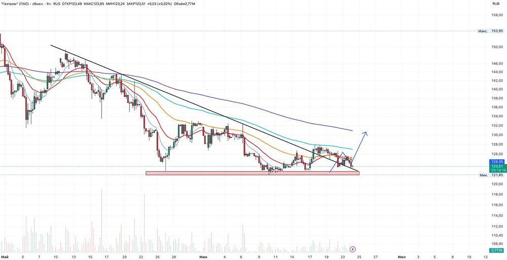 Акции Газпрома могут вырасти до 130 рублей, если бумага закрепится выше 125 рублей. В среднесрочной перспективе стоит рассматривать покупки от 122–120 рублей и ниже. На этих уровнях находятся сильные уровни поддержки. Данный материал носит информационный характер и не является индивидуальной инвестиционной рекомендацией или предложением о покупке или продаже указанной ценной бумаги. Источник: Среднесрочные идеи