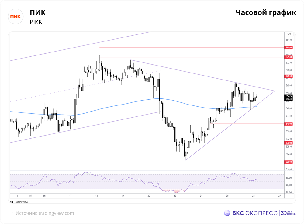 Мнение: БКС Экспресс Прогноз роста акций ПИК до 570 рублей на фоне технических сигналов Вчера акции ПИК выросли в цене на 0,62%, достигнув отметки 552,5 рубля. Объём торгов составил 2,1 млрд рублей. На утренней сессии акции продолжили рост, прибавив 0,36%, и достигли отметки 554,5 рубля. Краткосрочный анализ Умеренный рост стоимости акций сопровождался средним торговым оборотом. Акции выросли в цене, но их динамика была слабее, чем у индекса МосБиржи, который вырос на 1,6%. На дневном графике акции продолжают двигаться в рамках двухмесячного восходящего канала. Среднесрочный анализ Активизация спроса может быть связана с планами государства поддержать сектор жилищного строительства. Однако недавно появилась новость о том, что Минфин не поддержал расширение льготной ипотеки для семей с детьми до 14 лет из-за напряжённого бюджета. Закрытие торгов произошло выше 200-часовой скользящей средней цены. По итогам дня сформировалась позитивная краткосрочная техническая картина. Умеренно высокое утреннее значение индикатора относительной силы RSI на часовом графике указывает на то, что акции уже вышли из состояния перекупленности, которое наблюдалось накануне. В ближайшие дни акции ПИК выйдут из границ нейтральной технической фигуры «Сходящийся треугольник» на часовом графике. Учитывая позитивную тенденцию на дневном таймфрейме, возможен дальнейший рост до уровня 570 рублей, что вернёт акции к 200-дневной скользящей средней цене. Внешний фон Индекс S&P 500 вчера не показал значительных изменений. Фьючерсы на S&P 500 утром растут на 0,1%. Азиатские фондовые индексы демонстрируют разнонаправленные изменения. Цена на нефть Brent выросла на 0,3%, достигнув 67,9 долларов за баррель. Уровни сопротивления: 565, 575, 580 Уровни поддержки: 540, 530, 520 Долгосрочный анализ В конце июня 2025 года акции ПИК находятся ниже 200-дневной скользящей средней цены. Долгосрочная техническая картина остаётся нейтральной. В прошлом году акции ПИК демонстрировали слабость, что было связано с ухудшением фундаментальных условий. В первой половине 2024 года компания попала под санкции США и отказалась от выплаты годовых дивидендов. Позднее негативным фактором стало общее ухудшение ситуации в секторе жилищного строительства из-за сокращения доступности льготных ипотечных кредитов. В результате в 2024 году компания также не выплатила дивиденды. Аналитики БКС прогнозируют, что целевая цена акций ПИК в течение года составит 800 рублей, что означает потенциал роста стоимости акций ПИК на 44% от текущего уровня. Источник: bcs-express.ru Автор: Манжос Виталий Не является индивидуальной инвестиционной рекомендацией В этом сообщении представлено мнение экспертов инвестиционной компании или банка. Оно предоставляется исключительно для ознакомления и не является рекомендацией для покупки или продажи ценных бумаг, а также для принятия каких-либо коммерческих или других решений. Mondiara.com не несёт ответственности за содержание этого сообщения и последствия его использования.
