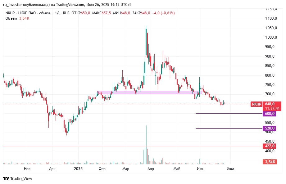 Долгосрочные инвестиции в НКХП: анализ уровней и стратегия без стопов. Долгосрочная идея постепенно приходит к целевым уровням добора. Идея на 3-5 лет, но перспективная. 💼 Буду понемногу покупать на уровнях 600, 520 и 427. ❌ Нижний уровень красный, но это не стоп. Долгосрок торгуется без стопов. Данный материал носит информационный характер и не является индивидуальной инвестиционной рекомендацией или предложением о покупке или продаже указанной ценной бумаги. [Больше анализа и новостей по любым акциям РФ находятся на mondiara.com](https://mondiara.com/) Источник: Хроники Инвестора