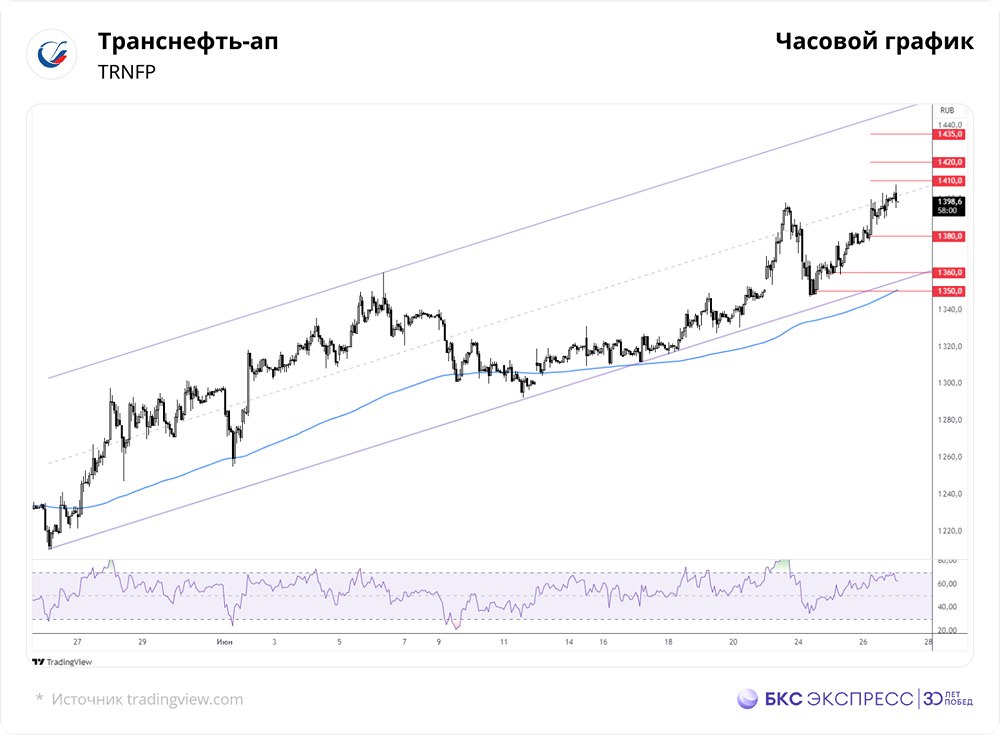 Мнение: БКС Экспресс Что говорит технический анализ: акции «Транснефть» и уровни поддержки на ближайшие дни Вчера акции компании «Транснефть» подорожали на 1,84%, достигнув отметки в 1402,8 рубля за акцию. Объём торгов составил 1,3 миллиарда рублей. На утренней сессии акции снизились на 0,36%, достигнув отметки в 1397,8 рубля за акцию. Краткосрочный анализ: — Заметное повышение стоимости сопровождалось средним торговым оборотом. Акции продемонстрировали более активный рост, чем индекс МосБиржи, который снизился на 0,05%. На часовом графике акции продолжают движение в рамках среднесрочного восходящего канала. Сегодня утром они достигли полугодового максимума, что является позитивным техническим сигналом. — Закрытие торгов произошло выше 200-часовой скользящей средней цены. По итогам дня сложилась позитивная краткосрочная техническая картина. Умеренно высокое утреннее значение индикатора относительной силы RSI на часовом графике указывает на близость к состоянию перекупленности. — В ближайшие дни акции «Транснефти» могут продолжить борьбу за закрепление выше или ниже значимого уровня 1400 рублей. Рост интереса к акциям может быть поддержан предстоящими выплатами щедрых годовых дивидендов в размере 198,25 рубля, что составляет около 14% от текущего курса. Внешний фон: — Индекс S&P 500 вчера вырос на 0,8%. Фьючерсы на S&P 500 сегодня утром демонстрируют рост на 0,1%. Ключевые азиатские фондовые индексы в основном растут. Цена на нефть марки Brent увеличилась на 0,7%, достигнув 68,2 доллара за баррель. Уровни сопротивления: 1410, 1420, 1435. Уровни поддержки: 1380, 1360, 1350. Долгосрочный анализ: — После дробления привилегированные акции «Транснефти» продолжают движение в средней части пересчитанного двадцатилетнего диапазона. Преодоление текущих уровней будет затруднено из-за большого количества старых технических сопротивлений. — В начале июня акции уверенно преодолели 200-дневную скользящую среднюю цену. Долгосрочная техническая картина улучшилась и стала умеренно позитивной. — Аналитики БКС прогнозируют потенциальное повышение стоимости акций до 1800 рублей в течение года, что означает рост на 29% от текущего уровня. Источник: bcs-express.ru Автор: Манжос Виталий Не является индивидуальной инвестиционной рекомендацией. В этом сообщении представлено мнение экспертов инвестиционной компании или банка. Оно предоставляется исключительно для ознакомления и не является рекомендацией для покупки или продажи ценных бумаг, а также для принятия каких-либо коммерческих или других решений. mondiara.com не несёт ответственности за содержание этого сообщения и последствия его использования.