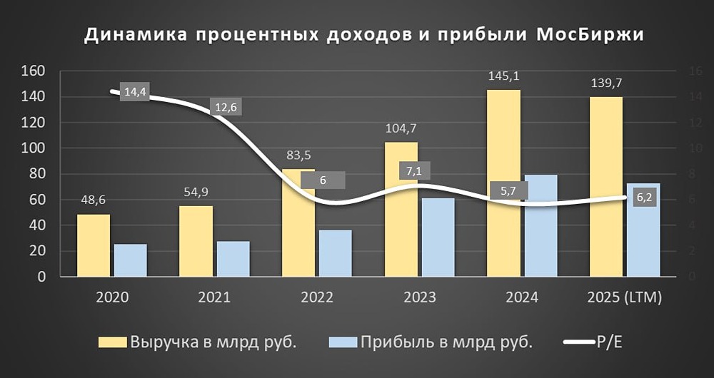 МосБиржа (MOEX) – крупнейший российский биржевой холдинг, который организует торги акциями, облигациями, производными инструментами, валютой, продуктами денежного рынка и товарами. Финансовые показатели Выручка - 2021: 54,9 млрд ₽ (+12,9% г/г) - 2022: 83,5 млрд ₽ (+52,1% г/г) - 2023: 104,7 млрд ₽ (+25,4% г/г) - 2024: 145,1 млрд ₽ (+38,6% г/г) - 2025 (1 кв.): 28,6 млрд ₽ (-15,9% г/г) Чистая прибыль - 2021: 27,6 млрд ₽ (+9,5% г/г) - 2022: 36,3 млрд ₽ (+31,5% г/г) - 2023: 60,8 млрд ₽ (+67,5% г/г) - 2024: 79,3 млрд ₽ (+30,4% г/г) - 2025 (1 кв.): 13 млрд ₽ (-33% г/г) Мультипликаторы - P/E: 6,17 (среднее 5,9) - P/BV: 1,91 (среднее 1,4) - P/S: 3,22 (среднее 1,66) - ROE: 26,2% (среднее 22,7%) - PEG: 0,62 (недорогая) - Долг/Капитал: 0 (среднее 2,1) - Модель DCF: 267 ₽ Ожидаемая годовая доходность: 14,8%. Вывод Анализ мультипликаторов, финансовых показателей и перспектив МосБиржи показывает, что компания оценена справедливо. Данный материал носит информационный характер и не является индивидуальной инвестиционной рекомендацией или предложением о покупке или продаже указанной ценной бумаги. [Больше анализа и новостей по любым акциям РФ находятся на mondiara.com](https://mondiara.com/) Источник: Что за Инвестор?