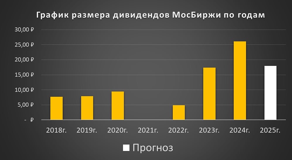 Дивиденды по акциям МосБиржи. Дивидендная история: 2020: 9,45 ₽ (+19,2% г/г) 2022: 4,84 ₽ 2023: 17,35 ₽ (+258,5% г/г) 2024: 26,11 ₽ (+50,5% г/г) Дивиденды за 2024 год: 26,11 ₽ (13,2%) Дата покупки: до 9 июля 2025 года Дата реестра: 10 июля 2025 года Акционеры утвердили рекордные дивиденды. На выплаты направят 75% чистой прибыли 2024 года. 👉 Прогноз на 2025 год: 16-25 ₽ на акцию Дивиденды по модели Гордона: Темп роста: 21% в год Теоретическая стоимость: 209 ₽ (на 5,9% выше текущей цены) 📝 Дивидендная политика до 2028 года: Минимальный уровень выплат: 50% от чистой прибыли по МСФО. Данный материал носит информационный характер и не является индивидуальной инвестиционной рекомендацией или предложением о покупке или продаже указанной ценной бумаги. [Больше анализа и новостей по любым акциям РФ находятся на mondiara.com](https://mondiara.com/) Источник: Что за Инвестор?