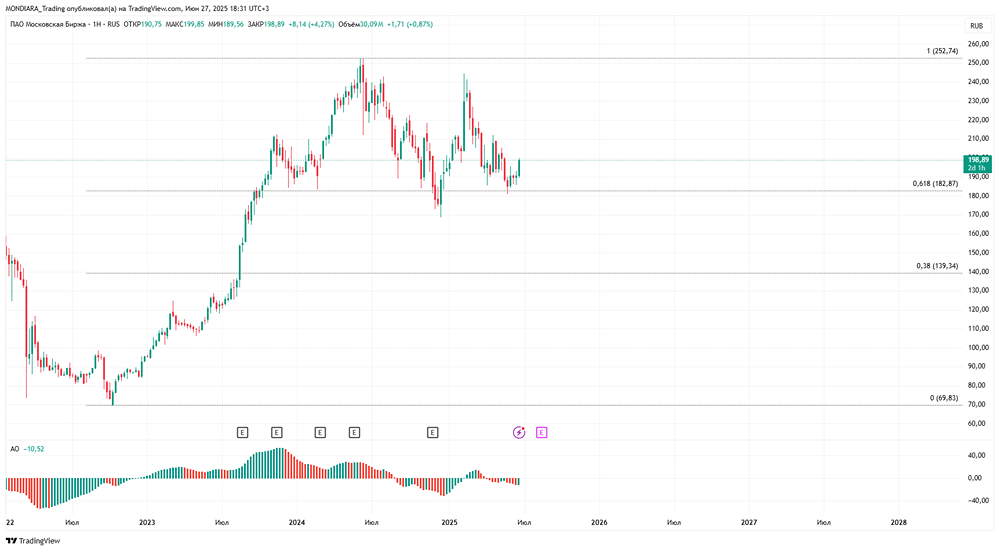 Вывод по МосБирже: перспективы на 2025 год. Первый квартал 2025 года для МосБиржи складывается неудачно. Прибыль упала на 33%, и ситуация вряд ли улучшится в ближайшее время. Проблема в снижении процентных доходов из-за оттока клиентских средств и других факторов. Во втором квартале комиссионные доходы также будут расти медленно. В мае объем торгов на Мосбирже снизился на 9% по сравнению с прошлым годом, достигнув 115,1 трлн рублей. Сейчас я нейтрально оцениваю перспективы Мосбиржи. Процентные доходы продолжат снижаться, а ключевая ставка будет падать. Рост дивидендов в 2025 году маловероятен. В 2024 году уже было направлено 75% прибыли. Увеличивать коэффициент дивидендных выплат сложно, а рост прибыли при текущих условиях маловероятен. Основной драйвер роста в будущем — увеличение комиссий. Но для этого нужно, чтобы торговая активность на бирже выросла, было проведено много IPO и рынок в целом развивался. Чем выше рынок, тем лучше для Мосбиржи, так как комиссии зависят от цены активов. За десять лет акции Мосбиржи показали около 337% полной доходности, включая дивиденды, или 15,9% годовых. Последний отчет был опубликован 6 марта 2025 года. Итоговый анализ: акции недооценены на 3,8%. Справедливая цена: 205 рублей. Рыночная цена: 198 рублей. Данный материал носит информационный характер и не является индивидуальной инвестиционной рекомендацией или предложением о покупке или продаже указанной ценной бумаги. [Больше анализа и новостей по любым акциям РФ находятся на mondiara.com](https://mondiara.com/) Источник: Что за Инвестор?