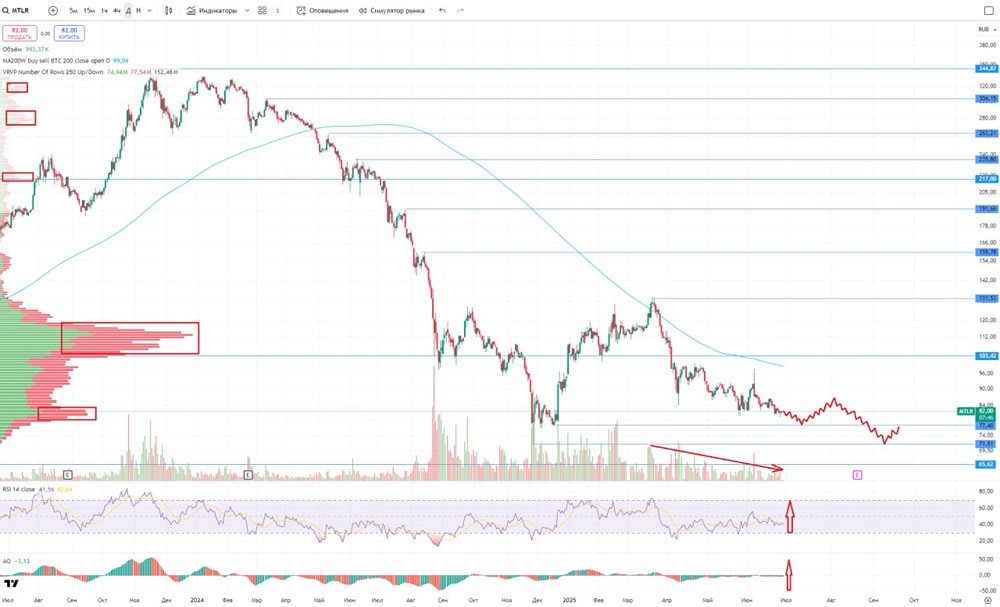 Сектор: горнодобывающая, металлургическая, электрогенерирующая и транспортная компания. Последнее время не было повода разбирать угольную отрасль, поэтому я решил включить в обзор «Мечел». Последний раз я рассматривал эту компанию 17 января. Тогда акции стоили 112 рублей, и я ожидал падения до 88. Эта идея полностью сработала: цена опустилась до 88, а сейчас торгуется по 82 рублям. Давайте посмотрим, что будет дальше. Основные метрики - Капитализация: 577 млн долларов (в прошлом году было в три раза больше) - P/E: отрицательное значение, компания убыточна - P/S: 0,12 - P/B: отрицательное значение - EPS: минус 66,88 рубля - EBITDA: 55,9 млрд рублей - EV/EBITDA: 5,2 По сравнению с прошлым обзором, «Мечел» стал убыточной компанией. Метрики оценки снизились, что говорит о серьёзных проблемах. Новостной фон - Из базы расчёта Индекса МосБиржи и Индекса РТС исключены акции «Мечела» (29 мая) - Акционеры «Мечела» одобрили невыплату дивидендов за 2024 год - Реализация основной продукции горнодобывающего бизнеса — концентрата коксующегося угля (ККУ) — увеличилась на 14% по сравнению с предыдущим кварталом - «Якутуголь» (входит в группу «Мечел») планирует увеличить добычу на 1,5 млн тонн в год - РСБУ 2024: убыток — 9,58 млрд рублей (против прибыли 6,55 млрд годом ранее) - ЕС ввёл санкции против председателя совета директоров «Мечела» Игоря Зюзина Финансовое здоровье - Собственный капитал компании упал на 65% и стал отрицательным — минус 99,8 млрд рублей - Чистый долг вырос на 2% и составил 245,3 млрд рублей - Net Debt / EBITDA — 4,39 Финансовое состояние компании крайне плохое. Выручка и прибыль - Выручка в 2024 году снизилась на 5%, в 2023 году — на 6% - Прибыль в 2024 году стала отрицательной и упала до минус 36,2 млрд рублей - Свободный денежный поток вырос на 8% и составил 44,3 млрд рублей Будущее и оценки На данный момент нет оснований для оптимистичных прогнозов. Страдальцы-акционеры Основные акционеры компании: - 26,5% — Игорь Зюзин - 2,6% — АОХК «Якутуголь» Сравнение с конкурентами «Мечел» отстаёт от сектора по многим показателям: - Долговая нагрузка выше, чем у конкурентов - Рентабельность капитала (ROE) выше среднего по сектору, но рентабельность активов (ROA) и рентабельность продаж (ROS) ниже - Рост выручки за последние 5 лет хуже, чем у конкурентов Дивиденды Компания не выплачивает дивиденды с 2012 года. Технический анализ Индикаторы на дневном таймфрейме указывают на рост, но это происходит на фоне вялого падения и боковика. Обычно такие ситуации заканчиваются небольшим движением вниз, к ближайшей поддержке в районе 75 рублей. Оттуда можно ожидать отскока до 85–90 рублей. После этого вероятно дальнейшее снижение. Пока ситуация с углём не улучшится, изменений ждать не стоит. Возможны краткосрочные всплески вверх из-за действий шортистов. Выводы Ничего хорошего. Отрицательный собственный капитал, отрицательная прибыль, рост большого долга. Единственная положительная сторона — выручка компании не обваливается. Если уголь вырастет в цене, это может привести к росту прибыли. Но сейчас компания находится в депрессивной фазе. Инвесторам стоит держаться подальше от «Мечела» до улучшения ситуации в отрасли. Данный материал носит информационный характер и не является индивидуальной инвестиционной рекомендацией или предложением о покупке или продаже указанной ценной бумаги. [Больше анализа и новостей по любым акциям РФ находя