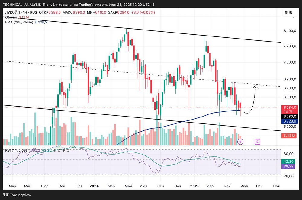 Продолжение анализа «Лукойла» ⛽️ $LKOH ТФ-1Д «Лукойл» снова пытается удержаться на дневной EMA-200 (около 6 230). Это уже третья попытка за последние два месяца. Объёмы торгов снижаются, но RSI поднимается выше 40 – уровня прошлого разворота. Если покупатели закроют день выше 6 350, возможен отскок к серединной линии канала (6 700–6 750), что добавит около 6–7 %. Главный риск – потеря уровня 6 200. В этом случае цена может упасть до нижней границы тренда (около 5 900), что составит примерно –5 %. Пока цена остаётся выше EMA-200, рассматриваем возможность открытия длинной позиции с коротким стоп-лоссом на уровне 6 150. Данный материал носит информационный характер и не является индивидуальной инвестиционной рекомендацией или предложением о покупке или продаже указанной ценной бумаги. [Больше анализа и новостей по любым акциям РФ находятся на mondiara.com](https://mondiara.com/) Источник: Капибара на Бирже