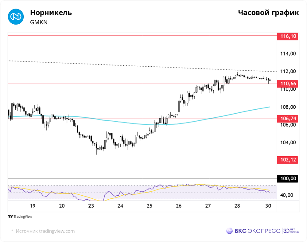 Мнение: БКС Экспресс Краткосрочный анализ акций «Норникеля»: уровни поддержки и сопротивления В пятницу акции «Норникеля» выросли на 1,07% и достигли отметки 111,58 рублей. В выходные бумаги снизились на 0,47% и достигли отметки 111,06 рублей. Объём торгов в пятницу был выше среднего и составил 3,31 млрд рублей. Сегодня утром акции в минусе на 0,2% по сравнению с закрытием воскресенья (есть видео). Краткосрочная картина В пятницу акции поддерживали восходящую динамику рынка. Индекс МосБиржи торговался разнонаправленно. Сам индекс прибавил 0,32% по итогам основной сессии, а на вечерних торгах вырос на 0,99% по сравнению с закрытием четверга. В выходные дни котировки снижались после волнообразного движения в пятницу. Утренние торги начались с отката на 0,6%, который был восстановлен в первые часы основной сессии. Затем акции упали до установленных утром минимумов и снова быстро восстановили потери. На вечерних торгах шаблон повторился, но нисходящее движение не привело к возврату на минимумы дня. Примечательно, что периоды восстановления сопровождались обновлением дневных максимумов. В конце основной сессии акции закрепились выше уровня сопротивления 110,7. Этот уровень выступил поддержкой в единичном случае тестирования, что не снимает вопрос о его устойчивости. Акции приблизились к максимуму начала июня, но для его обновления может не хватить времени. В выходные торги указывали на риск снижения котировок в начале недели. Объём торгов в пятницу оставался высоким, что необычно для конца недели. Стоит отметить, что фундаментально ситуация с ростом цен на ключевые металлы — палладий, платину и медь — остаётся позитивной. Геополитический фон позволяет надеяться на улучшение отношений с США и разрешение конфликта на Украине. Решение совета директоров не выплачивать дивиденды не стало неожиданностью, так как этот фактор был учтён в цене ещё в конце прошлого года. Данные по инфляции подтверждают высокую вероятность дальнейшего снижения ключевой ставки. В совокупности настроения инвесторов могут быть умеренно позитивными по нескольким направлениям. На 4-часовом графике RSI приближается к зоне перекупленности, но на других таймфреймах индекс либо уже вернулся в нейтральную зону, либо ещё не успел из неё выйти. Котировки остаются ниже EMA 200 на дневном и недельном графиках, но на часовом и 4-часовом таймфреймах акции торгуются выше скользящей средней. Внешний фон В пятницу индекс S&P 500 вырос на 0,52%. Фьючерс на S&P 500 прибавил 0,45%. Индексы Азиатско-Тихоокеанского региона торгуются без определённого направления. На мировых рынках утром цены на нефть марки Brent растут на 0,5% и достигают 67,6 долларов за баррель. Уровни сопротивления: 116,1 / 118,2 / 125 Уровни поддержки: 110,7 / 106,7 / 102,1 Долгосрочная картина В феврале 2021 года началась коррекция от исторических максимумов, которая переросла в долгосрочный нисходящий тренд. С тех пор котировки упали более чем на 60% от исторических максимумов. Пологий восходящий тренд, начавшийся в январе 2009 года, был прерван в апреле 2025 года из-за эскалации торговой войны. Следующий пологий тренд проходит через минимум декабря 2025 года на уровне 95. В конце марта 2025 года акции закрепились ниже 200-дневной скользящей средней цены. Долгосрочная техническая картина остаётся негативной, хотя и улучшается благодаря позитивной динамике на рынке пла