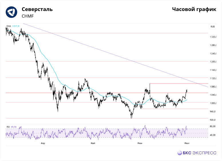 Мнение: БКС Экспресс Мы стремимся к достижению максимальных показателей за текущий месяц. В понедельник, 30 июня, акции компании «Северсталь» продемонстрировали рост на 2,19%, завершив торговую сессию на уровне 1055,6 рублей. Объём торгов составил 1,09 миллиарда рублей. На утренней сессии акции прибавили 0,7% и достигли отметки 1063 рубля. Краткосрочный анализ В пятницу акции «Северстали» уверенно росли и стали одними из лидеров среди голубых фишек. В понедельник рост продолжился, и акции вновь оказались среди лидеров роста. Рост акций связан с улучшением настроений на рынке. Ожидания более быстрого снижения ставки и, как следствие, улучшения ситуации в строительной отрасли, а также увеличение спроса на продукцию сталелитейных компаний и ослабление рубля оказали поддержку бумагам. На утренней сессии рост продолжается. Индекс относительной силы на дневном графике приближается к зоне перекупленности, но потенциал для роста ещё есть. Ближайшей целью является отметка 1095 рублей, куда бумага поднялась после решения Центрального банка снизить ставку. Далее внимание будет сосредоточено на диапазоне 1110–1120 рублей — это граница нисходящего тренда от максимумов 2024 года и апрельский пик. Пробой этой границы определит новую цель — 200-дневную скользящую среднюю на уровне 1149 рублей. В случае отката важно удержаться выше отметки 1050 рублей, достигнутой накануне. В качестве поддержки может выступить диапазон 1022–1018 — это экспоненциальная скользящая средняя за 200 дней на 4-часовом и часовом графиках. Если цена опустится ниже, то это может привести к возврату к минимумам прошлого года на уровне 1005 рублей. Внешний фон Индекс S&P 500 в понедельник закрылся в плюсе на 0,52%, а фьючерс снизился на 0,1%. Индексы Азиатско-Тихоокеанского региона демонстрируют разнонаправленную динамику: японский Nikkei теряет 0,8%, а китайский Shanghai Composite растёт на 0,2%. В Гонконге сегодня выходной день, поэтому торги не проводятся. Стоимость нефти Brent утром снизилась на 0,5%, до 66,4 доллара за баррель. Уровни сопротивления: 1095, 1120 и 1149 рублей. Уровни поддержки: 1050, 1018 и 1005 рублей. Долгосрочная перспектива В прошлом году акции «Северстали» достигли минимума на уровне 1005,4 рубля. Решение Центрального банка оставить ставку без изменений в декабре помогло бумагам восстановиться и выйти из среднесрочного нисходящего тренда, который начался в середине июня. Оптимизм, связанный с перспективами урегулирования конфликта на Украине, привёл к тому, что в конце февраля акции достигли уровня 1500 рублей. Однако этот рост был нивелирован: акции обновили минимумы 2024 года, а затем и минимумы с мая 2023 года. Сейчас акции пытаются восстановиться. В нашей стратегии на третий квартал мы понизили целевую цену акций «Северстали» до 950 рублей и сохраняем «негативный» прогноз. Это связано с ожиданием рекордных капитальных затрат в ближайшие 1–2 года, что приведёт к снижению денежного потока для выплаты дивидендов. Источник: bcs-express.ru Автор: Попова Анастасия Не является индивидуальной инвестиционной рекомендацией В этом сообщении представлено мнение экспертов инвестиционной компании или банка. Оно предоставляется исключительно для ознакомления и не является рекомендацией для покупки или продажи ценных бумаг, а также для принятия каких-либо коммерческих или других решений. Mondiara.com не несёт ответственности за соде
