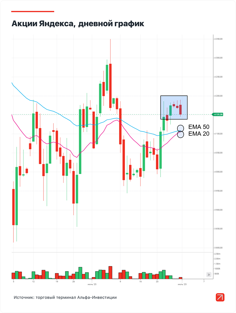 Мнение: Альфа-Инвестиции Цели и риски при торговле акциями на основе технического анализа Торговый план • Покупка (лонг): акции Яндекса по цене 4175 руб. • Срок: 1-2 недели • Цели: 4266 и 4350,5 руб. за акцию • Потенциальная доходность: 3,2% Суть концепции На графике сформировался технический паттерн, который указывает на продолжение восходящего тренда. Об этом свидетельствует одновременный рост 20- и 50-дневных EMA. Акция находится в среднесрочном восходящем тренде, и её цена растёт уже семь сессий подряд, что подтверждает вероятность продолжения роста. На часовом графике можно более детально рассмотреть техническую фигуру продолжения восходящей тенденции — «Треугольник». После импульса от 24 июня были сформированы все четыре точки построения ABCD. В качестве стандартной точки входа можно использовать закрытие (как минимум трёх часовых свечей) выше 20- и 50-часовой EMA на уровне 4175 рублей. Это значение выше текущего, и для завершения технического паттерна необходимо дождаться его достижения, прежде чем совершать сделку, так как вероятность продолжения роста в этом случае будет выше. Цель можно разделить на две части: 4266 и 4350,5 рублей. При достижении первого значения следует закрыть 50% позиции и перенести стоп в безубыток с учётом комиссии, а при достижении второго — продать оставшуюся часть. Стоп-заявку можно разместить на уровне 4098,5 рублей. Ориентиром служит горизонтальная линия, проведённая через точку B параллельно отрезку AC. Если цена опустится ниже этой линии, это с высокой вероятностью приведёт к слому технического паттерна и отказу от идеи. Источник: alfabank.ru Автор: Житник Роман Не является индивидуальной инвестиционной рекомендацией В этом сообщении представлено мнение экспертов инвестиционной компании или банка. Оно предоставляется исключительно для ознакомления и не является рекомендацией для покупки или продажи ценных бумаг, а также для принятия каких-либо коммерческих или других решений. Mondiara.com не несёт ответственности за содержание этого сообщения и последствия его использования.