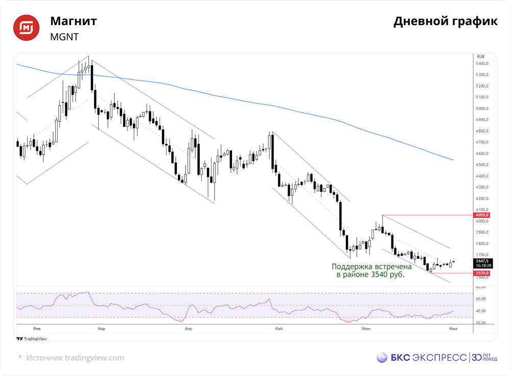 Мнение: БКС Экспресс Технический анализ акций «Магнит»: поддержка и уровни сопротивления Вчера акции компании «Магнит» выросли в цене на 0,9% по сравнению с пятничным закрытием, достигнув отметки в 3632,5 рубля. Объём торгов составил 1,8 миллиарда рублей. На утренних торгах акции продолжили рост, прибавив ещё 0,4%, и достигли отметки в 3647 рублей. Краткосрочные перспективы Умеренный рост стоимости сопровождался увеличением объёма торгов. Акции компании «Магнит» выросли вместе с индексом МосБиржи, который также продемонстрировал рост на 1,2%. На дневном графике можно наблюдать медленное восстановление цены после недавнего обновления трёхлетнего минимума. Среднесрочная поддержка находится на уровне 3540 рублей. Закрытие торгов вновь произошло ниже 200-часовой скользящей средней цены, но по итогам дня сложилась позитивная краткосрочная техническая картина. Умеренно высокое утреннее значение индикатора относительной силы RSI на часовом графике указывает на то, что акции пока не достигли состояния перекупленности. В ближайшие дни ожидается продолжение восстановительного роста акций компании «Магнит». Значимым уровнем сопротивления и целью выступает отметка в 3680 рублей. Внешний фон Индекс S&P 500 вчера вырос на 0,52%. Фьючерсы на S&P 500 сегодня утром показывают снижение на 0,2%. Азиатские фондовые индексы демонстрируют разнонаправленное движение. Цена на нефть марки Brent снизилась на 0,4%, достигнув отметки в 66,5 доллара за баррель. Уровни сопротивления: 3680, 3700, 3730. Уровни поддержки: 3600, 3580, 3540. Долгосрочные перспективы В конце июня акции компании «Магнит» значительно снизились ниже 200-дневной скользящей средней цены. Недавнее обновление долгосрочного минимума ухудшает перспективы на ближайшие недели. Акции компании по-прежнему находятся в средней части своего семилетнего диапазона. Долгосрочная техническая картина остаётся нейтральной, но существует риск её ухудшения. Прогноз по цене акций компании «Магнит» на горизонте года составляет 5000 рублей, что предполагает потенциальный рост стоимости в пределах 37% от текущего уровня. Источник: bcs-express.ru Автор: Манжос Виталий Не является индивидуальной инвестиционной рекомендацией В этом сообщении представлено мнение экспертов инвестиционной компании или банка. Оно предоставляется исключительно для ознакомления и не является рекомендацией для покупки или продажи ценных бумаг, а также для принятия каких-либо коммерческих или других решений. Mondiara.com не несёт ответственности за содержание этого сообщения и последствия его использования.