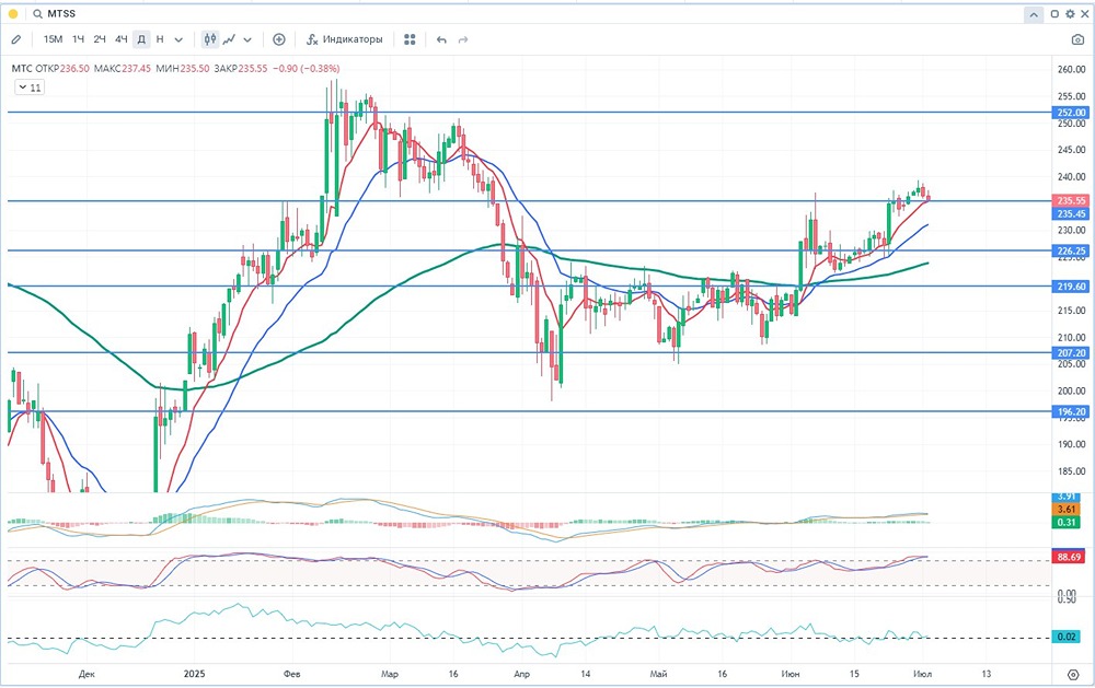 🚨 Разбор — MTC ✅ Добрый день, дамы и господа, инвесторы и трейдеры! 🚨 Публичное акционерное общество «Мобильные ТелеСистемы» (ПАО «МТС») — лидер на рынке России и стран СНГ в области мобильной и фиксированной связи, интернета, кабельного и спутникового телевидения, а также цифровых сервисов, включая финтех и медиа. Компания также предоставляет ИТ-решения в сфере коммуникаций, интернета вещей, автоматизации, мониторинга, облачных вычислений и информационной безопасности. МТС активно внедряет инновации, способствуя экономическому росту и улучшению качества жизни миллионов людей. ✅ Позитив: 📍 МТС готова рассмотреть продажу башенной инфраструктуры. 📍 Компания планирует вывести на биржу три дочерние компании. 📍 Диверсификация бизнеса включает фиксированную связь, интернет, МТС-Банк и облачные сервисы. 📍 Рейтинг AAA.ru от «НКР» подтвержден для 13 выпусков облигаций. 📍 Сильные рыночные позиции: 81 млн абонентов в России. ⛔ Негатив: 📍 Чистая прибыль снизилась, хотя выручка выросла. 📍 Отрицательный собственный капитал из-за агрессивной дивидендной политики. 📍 Замедление роста, ограниченность драйверов. 📍 Неопределенность с развитием 5G в России. 📢 Дополнительно: 🥇 Чистая прибыль МТС по МСФО за три месяца 2025 года составила 5,274 млрд рублей, что на 86,7% ниже по сравнению с 39,784 млрд рублей годом ранее. 🥈 Выручка увеличилась на 8,8% до 175,512 млрд рублей, OIBDA — на 7,1% до 63,3 млрд рублей. 🥉 Чистая прибыль МТС по МСФО за 2024 год составила 51,3 млрд рублей, что на 7,6% ниже по сравнению с 55,5 млрд рублей годом ранее. Выручка выросла на 16,1% до 703,7 млрд рублей. 💵 Дивиденды: Дивидендная политика МТС на 2024–2026 годы предполагает выплаты не менее 35 рублей на акцию в год. Компания учитывает денежный поток, капитальные затраты и долговую нагрузку. 💴 - $MTSS: ФА: Чистые активы: -37,7 млрд рублей Количество акций АО: 1998 млн Количество акций АП: 0 млн P/E: 13,3 P/S: 0,59 P/BV: -1,63 ROE: -83,6% EV/EBITDA: 3,63 DSI: 0,71 Данные актуальны на 2024 год. ⏰ ТФ 1D: 🛠 ТА: скользящие, стохастик, объём, MACD, уровни. 📈 Тренд вверх. ‼ Гистограмма MACD положительная, линии MACD выше нуля. Стохастик в зоне перекупленности. 3 июня цена пересекла 100 EMA снизу вверх. При закрытии ниже 231,02 возможен разворот вниз. ⏰ ТФ 4H: 🛠 ТА: скользящие, стохастик, объём, MACD, уровни. 📈 Тренд вниз. ‼ Гистограмма MACD отрицательная, линии MACD выше нуля. Стохастик выше средней линии, снижается. При закрытии выше 237,08 возможен разворот вверх. 📈 Вероятное развитие событий: Цена у уровня 235,5, вблизи локального максимума. Закрепление ниже может вызвать смену тренда на дневном таймфрейме. Фундаментально долг и чистый долг растут, а цена за пять лет упала. Дивиденды выплачиваются «в долг». Малоинтересная компания. За шесть месяцев (12.24–05.25) цена выросла более чем на 10%. Мин. цена: 198 Макс. цена: 258,2 📌 Цены смены тренда ориентировочные и могут смещаться со временем. 📌 🃏 Всем профита и до скорой встречи! 🃏