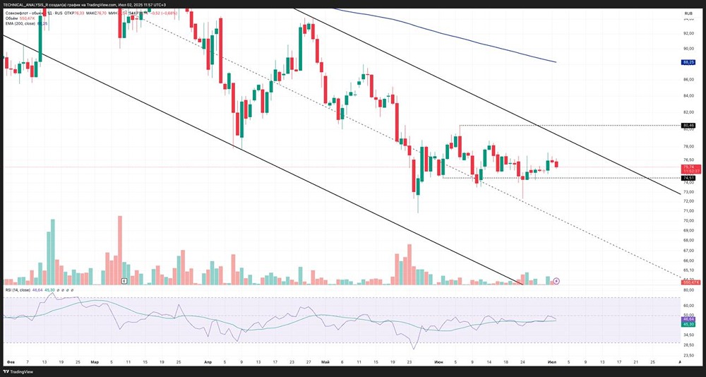 Мысли по «Совкомфлоту» ⚓️$FLOT ТФ-1Д Цена продолжает колебаться в узком медвежьем канале с ярко выраженным нисходящим трендом. Вершины и впадины графика стремятся к новым минимумам. После небольшого затишья мы снова топчемся у линии сопротивления (около 80,0–80,5), а ближайшая поддержка держится на уровне 74,5–75,0. Объемы торгов заметно снизились, а RSI едва поднялся до 46, что свидетельствует об отсутствии сил у покупателей. Если нам удастся закрыться выше 80,5 на хорошем объеме, можно ожидать рывка к 88, что составляет около +9 %. Однако далее цену встретит EMA-200, и без значимых новостей движение выше пока невозможно. Если цена не пробьет сопротивление, то откат к 74,5 выглядит почти неизбежным, что составляет -3 %. Если же цена опустится ниже 74, то можно ожидать ускорения к 70–68 (-9 %), где находится нижняя граница канала. Итог: на данный момент рынок настроен медвежьим образом. Торопиться с открытием длинной позиции пока не стоит, пока не увидим уверенный выход из канала. Однако короткая позиция от 80 с тейк-профитом чуть выше выглядит более логичной. Данный материал носит информационный характер и не является индивидуальной инвестиционной рекомендацией или предложением о покупке или продаже указанной ценной бумаги. [Больше анализа и новостей по любым акциям РФ находятся на mondiara.com](https://mondiara.com/) Источник: Капибара на Бирже