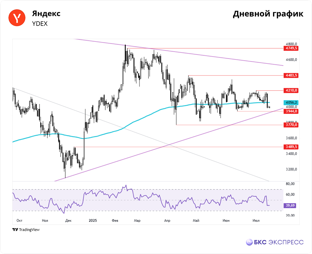 Мнение: БКС Экспресс Долгосрочные перспективы акций «Яндекс»: тренды и цели на ближайшее будущее В пятницу акции компании «Яндекс» потеряли в цене 4,19%. Стоимость закрытия составила 3993 рубля. Объём торгов был высоким и достиг 3,6 миллиарда рублей. Сегодня утром акции продолжают снижаться на 0,6%. Краткосрочный анализ В пятницу акции «Яндекса» значительно подешевели на фоне активной торговли. Большинство российских акций завершили день в отрицательной зоне. Индекс Мосбиржи потерял 3,31% в основной сессии, а к вечеру снизился на 0,32% по сравнению с закрытием торгов в четверг. В пятницу акции «Яндекса» продолжили падать. В конце дня был обновлён минимум за четыре недели, и закрытие произошло на уровне, близком к минимальному. По итогам дня сформировалась крупная свеча красного цвета. Это было самое значительное однодневное снижение с начала мая 2025 года. Причины падения акций: 1. Ухудшение настроений на рынке из-за ужесточения риторики президента США Дональда Трампа в отношении переговоров между Россией и США. 2. Решение совета директоров о дополнительной эмиссии акций. 3. Влияние пятницы, когда распродажи перед выходными усиливаются. По итогам недели акции не смогли удержаться выше 200-дневной скользящей средней, что является негативным фактором. С другой стороны, в текущей цене акций есть несколько уровней поддержки, включая восходящий тренд, сформировавшийся в декабре 2023 года, и уровень июньских минимумов. Если новостной фон останется нейтральным, то в ближайшие дни может произойти отскок. Внешний фон В пятницу индекс S&P 500 снизился на 0,33%, а фьючерс на индекс утром торгуется с понижением на 0,4%. Азиатские фондовые индексы растут. Фьючерс на нефть марки Brent на Московской бирже в пятницу вырос на 2,41%, но утром на мировых рынках нефть торгуется с понижением на 0,3% и стоит 69,9 доллара за баррель. Уровни сопротивления: 4210, 4403,5 и 4749,5. Уровни поддержки: 3944, 3770 и 3489,5. Долгосрочный анализ Глобальная динамика акций определяется восходящим трендом, который начался в сентябре 2015 года. В настоящее время он проходит около уровня 1650 рублей. С ноября 2021 года наблюдается долгосрочный нисходящий тренд. С исторических максимумов акции упали на 36%. Ближайшая среднесрочная цель — сломить долгосрочный нисходящий тренд в районе 4550 рублей и вернуться к максимумам года, к 4750. Недельная свеча даёт умеренно негативный технический сигнал. Среднесрочный прогноз ухудшается из-за снижения цены ниже уровня 200-дневной скользящей средней. Аналитики БКС дают позитивный прогноз по акциям «Яндекса» на ближайший год и ставят цель в 6600 рублей. Источник: bcs-express.ru Автор: Решетников Олег Не является индивидуальной инвестиционной рекомендацией В этом сообщении представлено мнение экспертов инвестиционной компании или банка. Оно предоставляется исключительно для ознакомления и не является рекомендацией для покупки или продажи ценных бумаг, а также для принятия каких-либо коммерческих или других решений. Mondiara.com не несёт ответственности за содержание этого сообщения и последствия его использования.