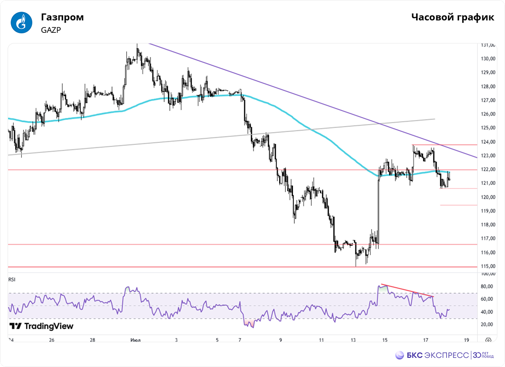 Мнение: БКС Экспресс Обзор торгов акциями «Газпрома»: уровни поддержки и сопротивления на ближайшие дни В четверг акции «Газпрома» подешевели на 1,65%, опустившись до 120,8 рублей. Объём торгов составил 4,6 миллиарда рублей. На утренней сессии акции выросли в цене на 0,2%. Краткосрочная ситуация Акции газовой компании снова начали снижаться после нисходящего тренда, который наблюдался в последние месяцы. Вчера цена акций снова достигла максимума предыдущего дня. Индикатор RSI показал тройную медвежью дивергенцию, после чего акции снова упали до уровня 200-часовой скользящей средней. Локальная поддержка на уровне 121,2 не сработала, и теперь ориентир смещается к 120,6. Выше подтягивается поддержка на уровне 50% коррекции к волне роста от минимумов июля — на уровне 119,5. Шансы на прорыв тренда всё ещё есть. Учитывая, что тренд смещается всё ниже, даже закрепление выше 123,8 будет положительным сигналом на ближайшие дни. Тактически, на этот сценарий стоит ориентироваться после возврата выше 200-часовой средней — последние три часа она явно оказывает сопротивление. Внешний фон Индекс S&P 500 вырос на 0,54% вчера. Фьючерс на S&P 500 сегодня утром прибавляет 0,2%. Нефть марки Brent подорожала на 0,4%, достигнув $69,8 за баррель. Индексы Азиатско-Тихоокеанского региона демонстрируют разнонаправленное движение. Уровни сопротивления: 122 / 123,8 / 125 / 128 Уровни поддержки: 120,6 /119,5 / 118,1 / 116–115 Долгосрочная ситуация После снижения в 2022 году акции опустились до уровней десятилетней давности и продолжают консолидироваться в боковом диапазоне. Наверху среднесрочный ориентир проходит на уровне 200-дневной средней, вблизи 136. Значительный отскок от минимумов 2025 года вселяет некоторый оптимизм. Чтобы сместить цели к средней, необходимо пробить пятимесячный нисходящий тренд. Аналитики БКС оценивают перспективы акций «Газпрома» как негативные, а целевой уровень — 130 рублей. Источник: bcs-express.ru Автор: Короев Альберт Данный материал носит информационный характер и не является индивидуальной инвестиционной рекомендацией или предложением о покупке или продаже указанной ценной бумаги. [Больше анализа и новостей по любым акциям РФ находятся в социальной сети для инвесторов и трейдеров mondiara.com](https://mondiara.com/)