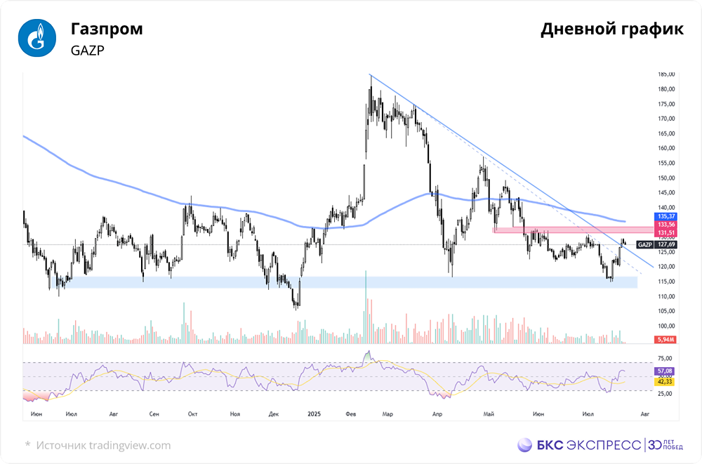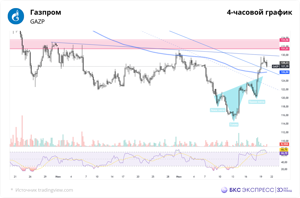 Мнение: БКС Экспресс Прогноз по бумагам Газпрома на недельный отрезок В пятницу акции Газпрома показали рост на 4,93%. Цена закрытия основной сессии составила 126,3 рубля, что на 4,55% больше, чем в начале сессии. Объём торгов составил 9,3 млрд рублей. Цена закрытия вечерней сессии составила 126,75 рубля, что на 4,93% выше, чем в начале сессии. Объём торгов — 1,5 млрд рублей. За выходные бумага прибавила ещё 1,17%. Сегодня утром наблюдается коррекция на 0,9%. Краткосрочный анализ На прошлой неделе акции Газпрома привлекли внимание покупателей. Котировки колебались в диапазоне от 112 до 119 рублей, неоднократно пытаясь преодолеть его верхнюю границу. В этот раз минимум коррекции был достигнут на уровне 115 рублей, после чего последовал резкий рост. Хотя объёмы покупок были выше, чем в предыдущие периоды, они всё же оставались ниже среднего уровня. Это может свидетельствовать о том, что актив пытается преодолеть нисходящее сопротивление, которое сформировалось в конце февраля. Для подтверждения пробоя необходимо, чтобы цена закрытия дня была выше нисходящей линии в течение двух дней подряд. На дневном графике можно выделить два уровня сопротивления: 131,5–133,5 рублей и 200-дневная скользящая средняя (EMA200) на уровне 135,3 рублей. На 4-часовом графике можно увидеть разворотную фигуру «Перевернутая голова и плечи». Её высота указывает на цели роста в диапазоне 131,5–133,5 рублей. Также можно выделить сопротивление на уровне 129,8–130 рублей. Ближайшая потенциальная поддержка находится в районе 125,7–126 рублей. Следующая поддержка — на уровне 123,5 рублей, который соответствует 200-периодной скользящей средней на часовом графике. Индикатор RSI на 4-часовом графике показывает перегрев, что может свидетельствовать о высокой вероятности локального коррекционного отката. Внешний фон Фьючерсы на индекс S&P 500 растут на 0,12%. Фьючерсы на нефть марки Brent (ближайший контракт на ICE Europe) торгуются на уровне $69,6, что на 0,49% выше предыдущей цены. Уровни сопротивления: 130, 131,5, 133,5. Уровни поддержки: 126, 123,5, 121. Долгосрочный анализ У акций Газпрома нет долгосрочного тренда, который был утрачен в прошлом году. Котировки находятся в боковом движении. В таком состоянии актив может оставаться в течение длительного времени. Можно выделить блок консолидации с примерными границами 130–155 рублей, в которых акции торговались в 2013–2017 годах. Более широкий диапазон с учётом выбросов — 110–170 рублей. Источник: Источник: bcs-express.ru Автор: Рокотянская Людмила Данный материал носит информационный характер и не является индивидуальной инвестиционной рекомендацией или предложением о покупке или продаже указанной ценной бумаги. [Больше новостей находятся в мобильном приложение MONDIARA](https://mondiara.com/) Скачайте бесплатное приложение в [App Store](https://apps.apple.com/ru/app/m-o-n-d-i-a-r-a/id6475953453) или [Google Play](https://play.google.com/store/apps/details?id=com.mondiara.app)