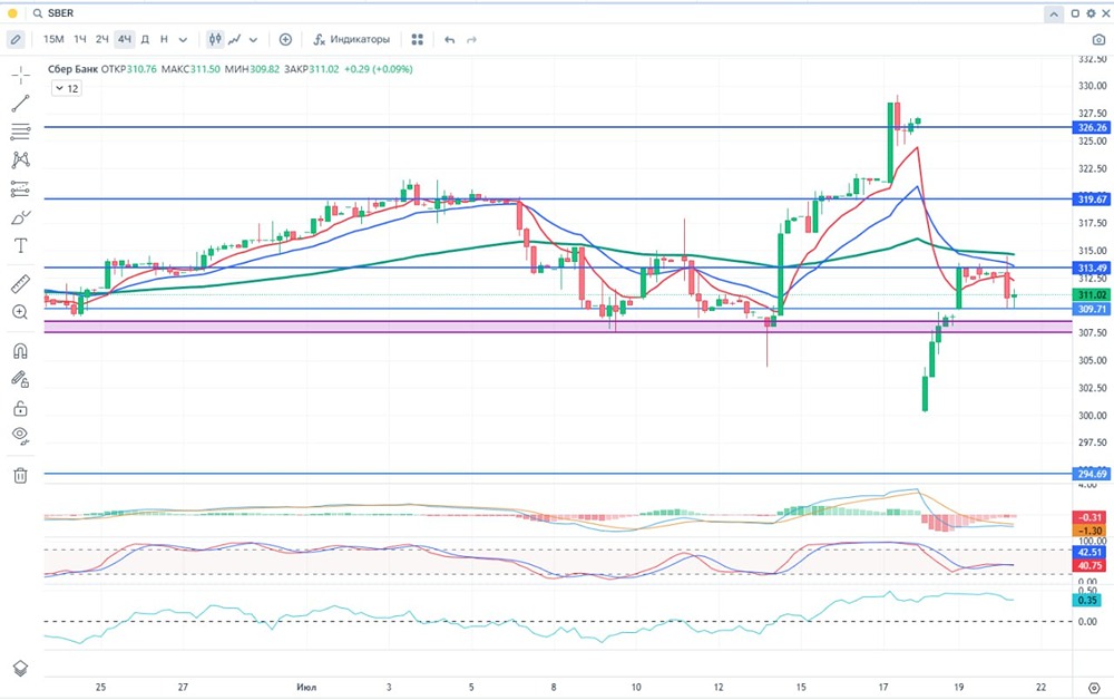 Добрый день, дорогие инвесторы и трейдеры! ПАО «Сбербанк» — крупнейший банк России и ведущий финансовый конгломерат. Он активно трансформируется в технологическую компанию, расширяя спектр услуг за пределы традиционной банковской деятельности. В его арсенале теперь не только финансовые услуги, но и онлайн-торговля, телеком, страхование, медицина и многое другое. #### Позитивные аспекты: 1. Крипто-кастодиальные услуги. 2. Новая система защиты клиентов от мошенников на маркетплейсе. 3. Рост инвестиций клиентов в золото и серебро. 4. Системообразующая роль в банковском секторе. 5. Стратегия до 2026 года, фокусирующаяся на искусственном интеллекте и IT-развитии с планируемыми инвестициями в размере 450 млрд рублей. 6. Низкий уровень долга. #### Негативные аспекты: 1. Новые правила по нормативам достаточности капитала. 2. Возможное замедление кредитования, что может повлиять на рост кредитного портфеля. 3. Санкционные риски. #### Дополнительно: 1. Чистая прибыль «Сбербанка» по РСБУ за июнь 2025 года составила 143,7 млрд рублей, увеличившись на 2,4% по сравнению с прошлым годом. 2. Чистый процентный доход вырос на 21,8% до 252,2 млрд рублей, в то время как комиссионный доход сократился на 6,7% до 59,7 млрд рублей. 3. По итогам первых шести месяцев 2025 года чистая прибыль достигла 826,6 млрд рублей, увеличившись на 7,5% по сравнению с прошлым годом. Процентный доход вырос на 15,5% до 1,437 трлн рублей, а комиссионный доход сократился на 1,4% до 348,8 млрд рублей. #### Дивиденды: Согласно дивидендной политике, «Сбербанк» выплачивает 50% чистой прибыли по МСФО. Дивиденды будут поддерживаться при уровне достаточности капитала не менее 13,3%. Выплаты производятся один раз в год поровну для обыкновенных и привилегированных акций. #### Финансовый анализ: - FA: - Чистые активы: 60,855 трлн рублей. - Количество обыкновенных акций: 21,587 млн. - Количество привилегированных акций: 1 млн. - P/E: 3,99. - P/S: 0,00. - P/BV: 0,67. - ROE: 24,0%. - EV/EBITDA: 0,0. - DSI: 0,54. Эти данные актуальны на 2024 год и взяты из официальных источников. #### Технический анализ: - ТФ 1 день: - Тренд: нисходящий. - Гистограмма MACD находится в отрицательных значениях, но линии MACD выше нуля. Стохастик выше средней линии и снижается. 18 июля цена пересекла 100 EMA снизу вверх, что указывает на восходящую тенденцию. Возможна смена тренда на восходящий при закрытии выше 313,3. - ТФ 4 часа: - Тренд: нисходящий. - Гистограмма MACD в отрицательных значениях. Стохастик чуть ниже средней линии. Возможна смена тренда на восходящий при закрытии выше 313,9. #### Прогнозы: На горизонте полугода возможно снижение цены до 270 рублей. Начало коррекции может начаться после пробития зоны поддержки с последующим движением к уровню 300 рублей. Возможные цели — 295-292 рубля. #### Заключение: Цены смены тренда являются ориентировочными и могут изменяться со временем. Всем удачи в инвестициях!