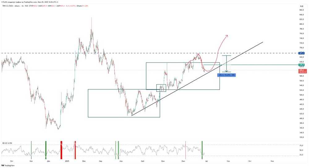 Ранее писал, что часть можно было покупать перед коррекцией. С тех пор цена упала на 10%. Сейчас она держится у наклонной поддержки. Однако стоит рассмотреть покупку, если цена преодолеет уровень сопротивления 628. Данный материал носит информационный характер и не является индивидуальной инвестиционной рекомендацией или предложением о покупке или продаже указанной ценной бумаги. [Больше новостей и анализа находятся в нашем мобильном приложении MONDIARA](https://mondiara.com/communities?open=community-17) Скачайте бесплатное приложение в [App Store](https://apps.apple.com/ru/app/m-o-n-d-i-a-r-a/id6475953453) или [Google Play](https://play.google.com/store/apps/details?id=com.mondiara.app) Источник: Восходящий тренд