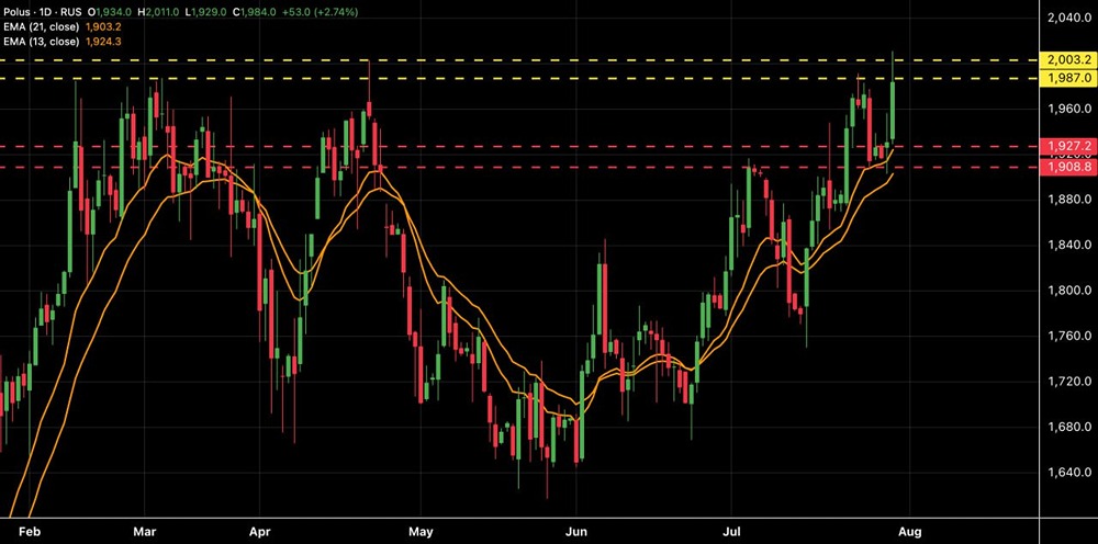Полюс (PLZL): рост до 2003 ₽ и прогноз коррекции в боковик