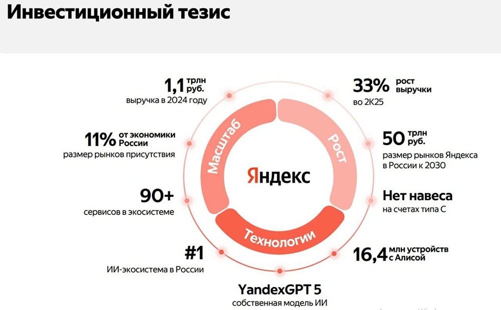 Яндекс – технологический гигант России. Спросите у Алисы, кто это. Кстати, она также ответит на вопрос о времени. Компания представила результаты за первый квартал 2025 года: 🟢 Выручка увеличилась на 34% до 639 млрд рублей. 🟢 Скорректированная EBITDA выросла на 35% до 114,9 млрд рублей. Рентабельность составила 18%. 🟣 Чистая прибыль осталась на уровне 43,2 млрд рублей, что на 2% ниже прошлогоднего показателя. На этот раз нет негативного влияния от сильного роста акций, как в прошлом году. Отчет показывает стабильную операционную прибыль. Поиск и портал – зрелый сегмент, который продолжает расти. Выручка увеличилась на 16%, скорректированная EBITDA – на 22%, рентабельность – 51,4%. 🚕 Райттех, доставка и электронная коммерция демонстрируют опережающую динамику. Выручка выросла на 41%, скорректированная EBITDA – на 78% до 20,8 млрд рублей. Особенно впечатляет рост выручки в электронной коммерции – 52% год к году, но пока этот сегмент остается убыточным. Однако сегмент держится на скорректированной EBITDA райттеха, которая составила 48,6 млрд рублей (+29% год к году). ➕ Яндекс Плюс вырос на 28% по числу подписчиков до 43,2 млн человек. Выручка фансервисов увеличилась на 46%, а скорректированная EBITDA достигла 4,3 млрд рублей. 📄 Сервисы объявлений показали рост выручки на 13%, но сохранили убыток в 1,5 млрд рублей по скорректированной EBITDA. 🟡 Прочие инициативы выросли по выручке на 73% до 77,2 млрд рублей и увеличили убыток по скорректированной EBITDA до 28,4 млрд рублей. Запуск новых проектов требует инвестиций, но в будущем они окупятся. Например, финтех вырос в три раза и может стать отдельным направлением. 📈 Компания сохраняет небольшую долговую нагрузку с коэффициентом Netdebt/EBITDA 0,5. Процентные расходы удвоились до 32,4 млрд рублей. 🤝 Яндекс сохраняет прогноз по финансовым результатам года: рост выручки на 30% и скорректированная EBITDA выше 250 млрд рублей. С учетом допэмиссии, компания торгуется по форвардным EV/EBITDA 6,9x и P/E около 15x. На текущий момент это рыночный уровень, но при возвращении оценки сектора ИТ к прежним значениям, Яндекс может стоить 6000 рублей. Кроме того, компания может достичь этой цели и без переоценки сектора, демонстрируя такие результаты. Данный материал носит информационный характер и не является индивидуальной инвестиционной рекомендацией или предложением о покупке или продаже указанной ценной бумаги. [Больше новостей и анализа находятся в нашем мобильном приложении MONDIARA](https://mondiara.com/communities?open=community-17) Скачайте бесплатное приложение в [App Store](https://apps.apple.com/ru/app/m-o-n-d-i-a-r-a/id6475953453) или [Google Play](https://play.google.com/store/apps/details?id=com.mondiara.app) Источник: БИРЖЕВОЙ МАКЛЕР