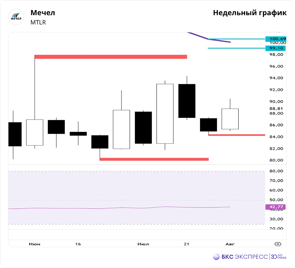 Мнение: БКС Экспресс Компания Мечел Акции компании «Мечел» на прошлой торговой сессии выросли на 1,87%, достигнув цены 89,35 руб на закрытии. Бумаги показали слабую динамику по сравнению с рынком, а объем торгов составил 1,19 млрд руб. Краткосрочная перспектива Акции стремятся к зоне сопротивления 93–94,4, достигнув максимума 90,5 руб. Пока поддержка 84,22 не пробита, риски для продолжения роста к 93 минимальны. Прорыв этой отметки откроет путь к долгосрочным целям. В первую очередь, следим за уровнями 93 и 84,22. Внешний фон Индекс S&P 500 в четверг снизился на 0,07%, но утром вырос на 0,2%. Азиатские индексы показывают смешанную динамику. Нефть Brent упала на 0,69% в четверг и продолжила снижение на 0,7% утром. Уровни сопротивления и поддержки: - Сопротивление: 93, 94,4, 98 - Поддержка: 84,22, 81,82, 80 Долгосрочная перспектива На недельном графике начался новый импульс роста после пробоя сопротивления 84,4. Потенциал движения позволяет достичь 99,1–100,69 руб. Сценарий остается актуальным, пока поддержка 84,22 не пробита. Локальные цели смотрим в краткосрочной перспективе. В долгосрочной картине важно обратить внимание на закрытие недельной свечи в пятницу. Автор: Мамонтов Андрей Данный материал носит информационный характер и не является индивидуальной инвестиционной рекомендацией или предложением о покупке или продаже указанной ценной бумаги. [Больше новостей и анализа находятся в нашем мобильном приложение MONDIARA](https://mondiara.com/communities?open=community-17) Скачайте бесплатное приложение в [App Store](https://apps.apple.com/ru/app/m-o-n-d-i-a-r-a/id6475953453) или [Google Play](https://play.google.com/store/apps/details?id=com.mondiara.app) Источник: bcs-express.ru