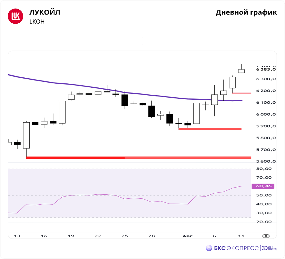 Мнение: БКС Экспресс Акции компании Лукойл В прошлую пятницу акции ЛУКОЙЛа выросли на 1,89% и закрылись на отметке 6320 рублей. Бумаги показали динамику лучше рынка, объем торгов составил 6,09 млрд рублей. Краткосрочная перспектива Сегодня акции открылись с гэпом вверх и достигли целей 6420–6483, определенных в долгосрочном сценарии роста. Текущий максимум дня зафиксирован на уровне 6430 рублей. Сценарий роста остается актуальным, пока не будет сломана поддержка на уровне 5870,5 рублей. Первый сигнал к откату — преодоление уровня 6179,5 рублей. На дневном графике индикатор RSI находится на уровне 60 пунктов. На 4-часовом таймфрейме акции торгуются выше 50-дневной и 200-дневной скользящих средних. Основные уровни для наблюдения — 6430 и 6179,5 рублей. Внешний фон Индекс S&P 500 в пятницу вырос на 0,74%, а утром показал прирост 0,1%. Азиатские индексы торгуются преимущественно в плюсе. Нефть Brent за день подорожала на 0,24%, а утром снизилась на 0,4%. Уровни сопротивления и поддержки Сопротивление: 6430, 6700, 6840 рублей. Поддержка: 6179,5, 5870,5, 5626 рублей. Долгосрочная перспектива Пробой максимума недели на уровне 6118 рублей привел к новому развороту наверх с целями роста 6420–6483 рублей. Сценарий падения в область 5450–5620 рублей утратил актуальность после пробоя сопротивления 6249,5 рублей. Долгосрочный прогноз по акциям ЛУКОЙЛа остается умеренно позитивным. Фундаментальные факторы создают противоречивую картину. Эмбарго на нефть и нефтепродукты в ЕС несет риски для компании, однако перенаправление поставок может сохранить достойную прибыль на фоне высоких мировых цен на нефть. Автор: Мамонтов Андрей Данный материал носит информационный характер и не является индивидуальной инвестиционной рекомендацией или предложением о покупке или продаже указанной ценной бумаги. [Больше новостей и анализа находятся в нашем мобильном приложение MONDIARA](https://mondiara.com/communities?open=community-17) Скачайте бесплатное приложение в [App Store](https://apps.apple.com/ru/app/m-o-n-d-i-a-r-a/id6475953453) или [Google Play](https://play.google.com/store/apps/details?id=com.mondiara.app) Источник: bcs-express.ru
