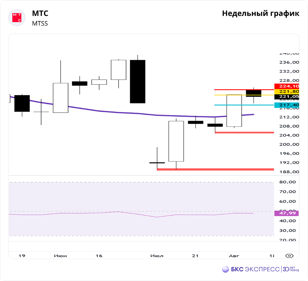 Мнение: БКС Экспресс Акции МТС - краткосрочный взгляд и перспектива Акции МТС на прошлой торговой сессии подорожали на 0,14%, закрывшись на уровне 222,1 руб. Это был лучший результат по сравнению с рынком. Объем торгов составил 0,49 млрд руб. Краткосрочная перспектива • Акции находятся в зоне максимальных значений недельного графика 221,8–224,1. Максимум зафиксирован на уровне 225,1. • Пробой поддержки 218,05 может вызвать откат. Ждем формирования новых паттернов для оценки будущих целей. • RSI дневного графика находится на уровне 58 п. На 4-часовом таймфрейме цена выше 50- и 200-дневной скользящих средних. Основное внимание уделяем структуре графика и уровням 225,1 и 218,05. Внешний фон Индекс S&P 500 вырос на 0,31% в среду, но утром снизился на 0,1%. Индексы АТР показывают смешанную динамику. Нефть Brent упала на 0,74% в среду, но утро встретила в плюсе на 0,4%. Уровни сопротивления: 225,1, 239,35, 250,9 Уровни поддержки: 218,05, 205, 188,7 Долгосрочная перспектива Цели • На недельном графике целевые уровни роста: 217,4 и 221,8–224,1. Все текущие цели достигнуты, следим за реакцией продавцов. • Локальные цели движения оцениваем в краткосрочной перспективе. Дивиденды • Реестр акционеров, имеющих право на получение дивидендов, был закрыт 7 июля 2025 г. Размер дивидендов на акцию составляет 35 руб., что дает доходность 15%. Автор: Мамонтов Андрей Данный материал носит информационный характер и не является индивидуальной инвестиционной рекомендацией или предложением о покупке или продаже указанной ценной бумаги. [Больше новостей и анализа находятся в нашем мобильном приложение MONDIARA](https://mondiara.com/communities?open=community-17) Скачайте бесплатное приложение в [App Store](https://apps.apple.com/ru/app/m-o-n-d-i-a-r-a/id6475953453) или [Google Play](https://play.google.com/store/apps/details?id=com.mondiara.app) Источник: bcs-express.ru
