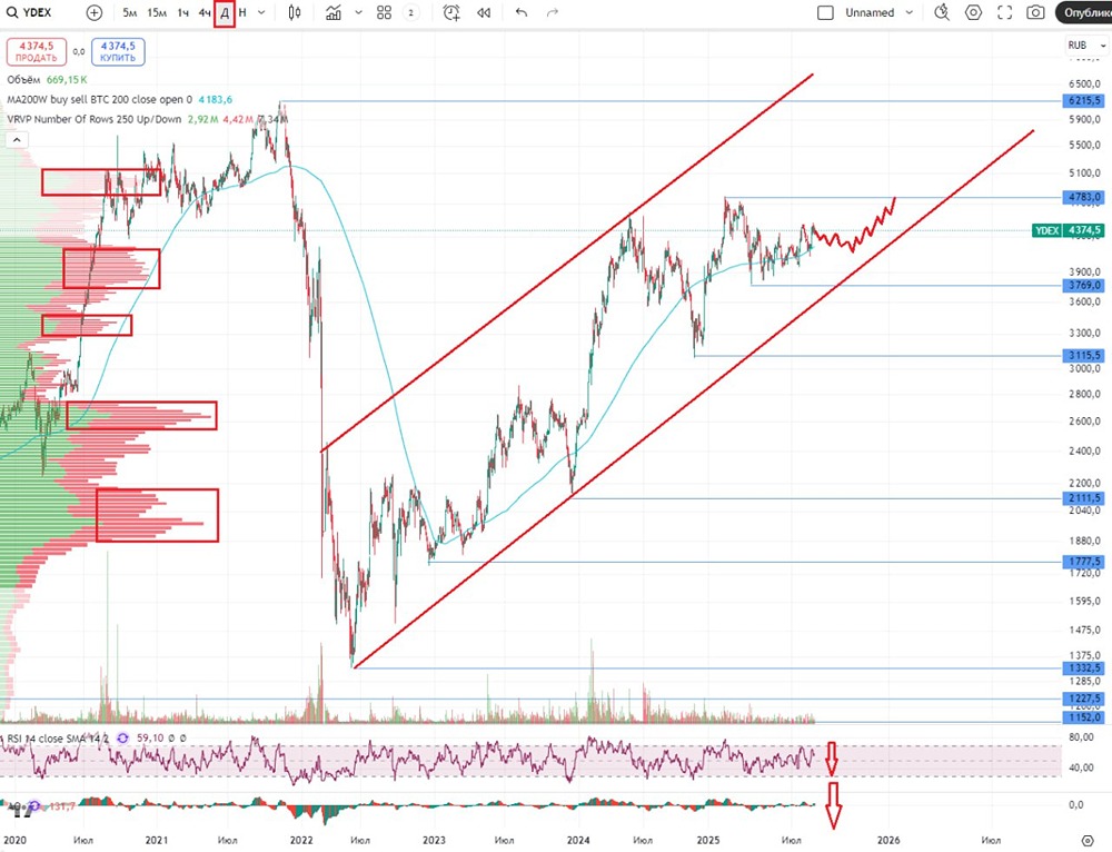 Аналитика по компании Последний обзор Яндекса я делал 2 июня. Тогда акции стоили 4067 рублей, и я ожидал их роста до 4500–4750 рублей. По факту они выросли до 4460 рублей, что близко к моим прогнозам. Сейчас акции торгуются по 4374 рубля. Давайте посмотрим, что нас ждет дальше. 🔹 Основные метрики - Капитализация: 21,34 миллиарда долларов. - P/E: 59,32. - P/S: 1,35. - P/B: 5,81. - EPS: 73,09 рубля. - EBITDA: 218,2 миллиарда рублей. - EV/EBITDA: 8,21. По сравнению с прошлым обзором, Яндекс вернулся в прибыль, что положительно сказалось на всех метриках. Недавно вышел отчет за первое полугодие 2025 года, который я разберу. 🔹 Новостной фон - Яндекс определил цену допэмиссии для программы долгосрочной мотивации. - Компания начала выпускать нижнее белье и домашнюю одежду. - Дивиденды за первое полугодие 2025 года составят 80 рублей на акцию, отсечка — 29 сентября. - Чистая прибыль по РСБУ за первое полугодие 2025 года выросла на 108,8 миллиарда рублей по сравнению с предыдущим годом. - Яндекс обещает увеличить выручку на 30% в этом году. - Компания рассчитывает, что Мосбиржа увеличит её вес в индексе в конце августа. 🔹 Финансовое здоровье - Собственный капитал за первое полугодие 2025 ТТМ упал на 1%. - Чистый долг сократился на 24%. - Net Debt / EBITDA — 0,45, что говорит о незначительной долговой нагрузке. Финансовое здоровье компании хорошее, но не идеальное из-за наличия долга. По сравнению с прошлым отчетом ситуация немного улучшилась. 🔹 Выручка и прибыль - Выручка за первое полугодие 2025 ТТМ выросла на 15%. - Прибыль за этот же период увеличилась на 149%. - Свободный денежный поток сократился менее чем на 1% по сравнению с 2024 годом. 🔹 Будущее и оценки С 23 июля по 1 августа 2023 года появились четыре свежие оценки акций Яндекса с целевыми ценами от 4730 до 6000 рублей. 🔹 Основные акционеры 67,5% акций принадлежит АО «СОЛИД Менеджмент». 🔹 Сравнение с конкурентами Яндекс — крупнейшая компания в своем секторе по капитализации. По метрикам она оценивается дороже рынка. Компания платит небольшие дивиденды, что лучше, чем у большинства конкурентов, которые вообще не платят. Метрики рентабельности средние, ближе к негативным. В моем рейтинге IT-компаний России Яндекс занял 7 место. 🔹 Дивиденды С 2024 года Яндекс начал платить дивиденды. За 2024 год они составили 1,93%, за 2025 — 1,83%. Для бурно развивающейся IT-компании это удивительно и, на мой взгляд, не очень разумно. 🔹 Технический анализ Индикаторы на дневном таймфрейме предполагают небольшую коррекцию. После неё цена может снова протестировать уровень сопротивления 4780 рублей. 🔹 Выводы Выручка и прибыль Яндекса продолжают расти. Однако собственный капитал компании упал на 1% за первое полугодие 2025 года. Меня беспокоит допэмиссия ради поощрения неизвестных руководителей. Также я не поддерживаю идею выпуска одежды для IT-компании. Выплата дивидендов для развивающейся IT-компании кажется мне сомнительной. Несмотря на эти опасения, я считаю Яндекс крупнейшей IT-компанией России и держу акции в своем портфеле, хотя и в небольшом объеме. Буду следить за динамикой, чтобы понять, куда движется компания. Возможно, я ошибаюсь, и отчеты в следующие кварталы это покажут. ______________________________________________ Данный материал носит информационный характер и не является индивидуальной инвестиционной рекомендацией или предложением о покупке или продаже указанной ценной бумаги. ______________________________________________ [Больше новост