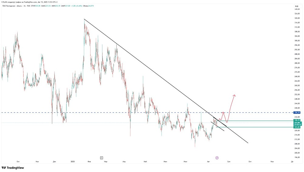 Цена приблизилась к ключевому сопротивлению и сформировала бычий флаг 🔹 Если уровень 228,7 будет пробит, а затем закреплён выше, ожидается разворот вверх 🔹 Ближайшая цель — 236 🔹 Если же произойдёт коррекция, она будет небольшой 🔹 В этом случае стоит искать точки для покупки Данный материал носит информационный характер и не является индивидуальной инвестиционной рекомендацией или предложением о покупке или продаже указанной ценной бумаги. Больше новостей и анализа находятся в нашем мобильном приложение [m o n d i a r a](https://i.mondiara.com/) Скачать в [App Store](https://apps.apple.com/ru/app/m-o-n-d-i-a-r-a/id6475953453) Скачать в [Google Play](https://play.google.com/store/apps/details?id=com.mondiara.app) Источник: Восходящий тренд