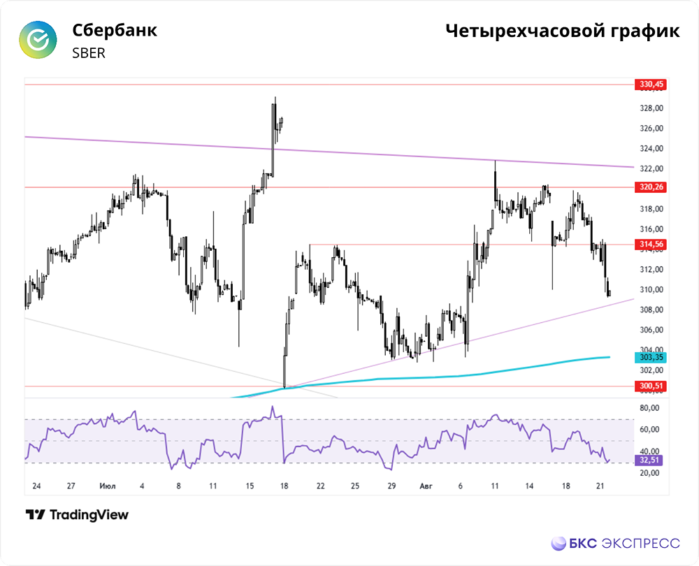 Мнение: БКС Экспресс Торговый взгляд на акции Сбербанка Акции Сбербанка в четверг потеряли в цене 1,33%, закрывшись на уровне 309,98 рубля. Объем торгов был средним — 9,6 млрд рублей. Сегодня утром акции торгуются без изменений (есть видео). 🔹 Краткосрочная динамика • В четверг акции Сбербанка значительно снизились на фоне умеренной торговой активности. Большинство российских акций вчера двигались вниз. Индекс МосБиржи потерял за основную сессию 1,95%, а по итогам дня — 1,97%. • Утром акции Сбера снижались, но затем начался небольшой отскок, который быстро закончился. Во второй половине дня падение ускорилось. • За день сформировалась негативная свеча с большим диапазоном и закрытием у минимумов, что указывает на вероятность продолжения коррекции в ближайшее время. • Уровень поддержки в районе 314 рублей был пробит, что также является негативным сигналом. • Апрельская восходящая линия тренда, проходящая около 308 рублей, может сдержать дальнейшее падение. Если она будет пробита, среднесрочная восходящая структура нарушится, и акции могут упасть до 300 и 291,6 рублей. Следим за динамикой у этой линии. • Причина вчерашнего снижения — рост геополитической напряженности. МИД РФ отметил, что Украина не заинтересована в долгосрочном урегулировании конфликта. Комментарии Трампа о том, что он не давал Украине возможности для полноценного военного ответа, добавили масла в огонь. Однако зарубежные СМИ сообщили, что Трамп может временно отойти от темы российско-украинских переговоров, чтобы стороны могли договориться сами. 🔹 Внешний фон Индекс S&P 500 упал в четверг на 0,4%, фьючерсы на него утром нейтральны. Индексы Азиатско-Тихоокеанского региона (АТР) торгуются разнонаправленно. Фьючерсы на Brent на Мосбирже выросли на 0,9%, на мировых рынках нефть утром стабильна на уровне $67,1. Уровни сопротивления: 314,56 / 320,26 / 330,45 Уровни поддержки: 308 / 300,51 / 291,66 🔹 Долгосрочная перспектива • Акции Сбербанка торгуются на 20% ниже исторического максимума. В феврале 2022 года был пробит многолетний восходящий тренд, начавшийся в 2014 году. • Поддержка найдена на уровне пологого растущего тренда, который тянется от минимумов 2009 года. До середины 2024 года акции уверенно росли, после чего началась коррекция. • Снижение удалось остановить в декабре благодаря решению ЦБ не повышать ключевую ставку. Среднесрочная структура сменилась на восходящую. Пробитие 200-дневной скользящей значительно улучшило перспективы. • Ближайшие цели — закрепление выше долгосрочной нисходящей трендлинии и обновление максимумов 2024 года на уровне 330 рублей. • Последняя недельная свеча — локальная коррекционная. Она не нарушила краткосрочную растущую формацию, сформированную на предыдущей неделе. • Аналитики БКС считают перспективы акций «позитивными» и прогнозируют цель на год — 400 рублей. Автор: Решетников Олег Данный материал носит информационный характер и не является индивидуальной инвестиционной рекомендацией или предложением о покупке или продаже указанной ценной бумаги. Больше новостей и анализа находятся в нашем мобильном приложении [m o n d i a r a](https://i.mondiara.com/) Скачать в [App Store](https://apps.apple.com/ru/app/m-o-n-d-i-a-r-a/id6475953453) Скачать в [Google Play](https://play.google.com/store/apps/details?id=com.mondiara.app) Источник: bcs-express.ru