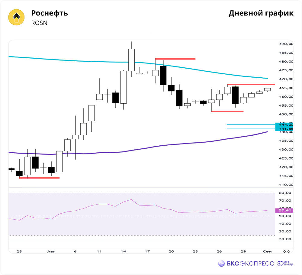 Мнение: БКС Экспресс Торговый взгляд на акции Роснефти В прошлую пятницу акции Роснефти выросли на 0,79%, достигнув цены 459,75 рублей на закрытии. Торги прошли лучше рынка, объем составил 1,28 млрд рублей. 🔹 Краткосрочная перспектива • Утром котировки продолжили локальный рост, достигнув максимума 465. • На дневном графике сформировались первые цели снижения — 441,85–444,2. Сопротивление на уровне 467,4 пока не пробито, сценарий падения остается актуальным. • На дневном таймфрейме RSI находится на уровне 57. На 4-часовом графике цена выше 50- и 200-дневных скользящих средних. Основное внимание уделяем уровням сопротивления и поддержки: 482,2 и 453,9. 🔹 Внешний фон • Индекс S&P 500 в прошлую пятницу снизился на 0,69%. 1 сентября биржи США закрыты в связи с Днем труда. Индексы Азиатско-Тихоокеанского региона торгуются разнонаправленно. Цена на нефть Brent упала на 0,74% в пятницу и с утра остается в минусе на 0,3%. Уровни сопротивления: 467,4 / 482,2 / 491,4 Уровни поддержки: 453,9 / 451,6 / 413,6 🔹 Долгосрочная перспектива • Начался первый импульс роста. Ждем завершения коррекции для оценки дальнейших целей на недельном таймфрейме. • Текущее движение анализируем в рамках краткосрочной картины. • На месячном графике остается незакрытая цель роста 631 рубль. • В долгосрочной перспективе важно следить за закрытием недельной свечи в конце пятницы. Автор: Мамонтов Андрей Данный материал носит информационный характер и не является индивидуальной инвестиционной рекомендацией или предложением о покупке или продаже указанной ценной бумаги. Больше новостей и анализа находятся в нашем мобильном приложении [m o n d i a r a](https://i.mondiara.com/) Скачать в [App Store](https://apps.apple.com/ru/app/m-o-n-d-i-a-r-a/id6475953453) Скачать в [Google Play](https://play.google.com/store/apps/details?id=com.mondiara.app) Источник: bcs-express.ru