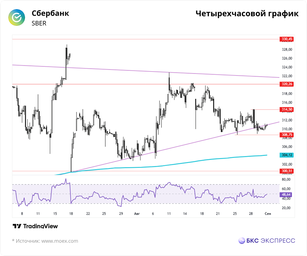 Мнение: БКС Экспресс Анализ акций компании "Сбербанк" Акции Сбербанка в пятницу снизились на 0,25%, закрывшись на уровне 310,04 рубля. Объем торгов был низким — 4,6 миллиарда рублей. Сегодня утром бумаги немного выросли, прибавив 0,2%. 🔹 Краткосрочный анализ • В пятницу акции Сбербанка снизились при низких объемах торгов. Динамика российских акций в тот день была неоднозначной: индекс МосБиржи упал на 0,46% за основную сессию и вырос на 0,3% к вечеру. • В течение дня акции Сбербанка плавно снижались, но перед закрытием показали резкий рост, отыграв большую часть потерь. Однако устойчивая восходящая тенденция не сформировалась, и бумаги продолжили падать. В субботу динамика была нейтральной, а в воскресенье произошел отскок, который практически компенсировал пятничные потери. • На выходных сформировался слабый технический сигнал разворота вверх на низких объемах. Снижение замедлилось у уровня поддержки 308,75 рубля. Волатильность на рынке остается низкой, большинство участников ждут новостей для определения дальнейшего направления. • Сегодня котировки могут поддержать заявления Трампа о возможной трехсторонней встрече с Путиным и Зеленским. 🔹 Внешний фон • Индекс S&P 500 упал на 0,64% в пятницу, утром фьючерсы на индекс были нейтральны. Азиатские индексы торгуются разнонаправленно. Фьючерсы на нефть Brent потеряли 0,19% на Мосбирже и 0,4% на мировых рынках, торгуясь на уровне $67,1. 🔹 Ключевые уровни • Сопротивления: 314, 320,26, 330,45 • Поддержки: 308,75, 302,81, 300,51 🔹 Долгосрочный анализ • Акции Сбербанка торгуются на 20% ниже исторического максимума. В феврале 2022 года был пробит многолетний тренд, начавшийся в 2014 году. • Поддержка найдена на уровне растущего тренда, берущего начало с минимумов 2009 года. До середины 2024 года акции уверенно росли, затем началась коррекция. • В декабре снижение было остановлено благодаря решению ЦБ не повышать ключевую ставку. Среднесрочный тренд стал восходящим, а преодоление 200-дневной скользящей значительно улучшило перспективы. • Ближайшие цели — закрепление выше долгосрочной нисходящей трендовой линии и обновление максимумов 2024 года на уровне 330 рублей. • Последние три недельные свечи представляют собой локальные коррекции, не нарушая краткосрочную растущую формацию. Однако ситуация может измениться, если апрельская восходящая трендовая будет пробита и произойдет явное закрепление ниже. • Аналитики БКС сохраняют позитивный взгляд на акции Сбербанка, прогнозируя цель на уровне 400 рублей в течение года. Автор: Решетников Олег Данный материал носит информационный характер и не является индивидуальной инвестиционной рекомендацией или предложением о покупке или продаже указанной ценной бумаги. Больше новостей и анализа находятся в нашем мобильном приложении [m o n d i a r a](https://i.mondiara.com/) Скачать в [App Store](https://apps.apple.com/ru/app/m-o-n-d-i-a-r-a/id6475953453) Скачать в [Google Play](https://play.google.com/store/apps/details?id=com.mondiara.app) Источник: bcs-express.ru