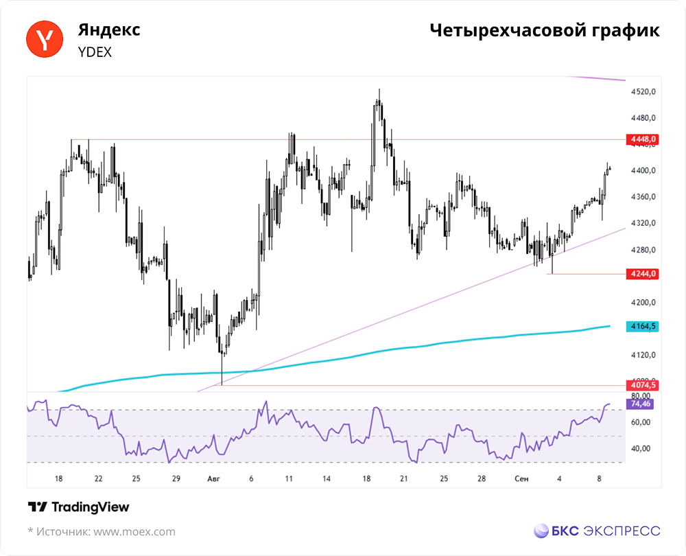 Мнение: БКС Экспресс Аналитика по акциям "Яндекса" В понедельник акции Яндекса подорожали на 1,47%, завершив день на уровне 4405 рублей. Объем торгов был средним — 2,9 млрд рублей. Утром вторника бумаги продолжили расти, прибавив еще 0,4%. 🔹 Краткосрочная перспектива • Акции Яндекса заметно выросли вчера, несмотря на умеренную активность торгов. Большинство российских акций закрылись в плюсе. Бенчмарк поднялся на 0,7% за основную сессию и на 0,59% вечером по сравнению с закрытием в пятницу. • Утром акции Яндекса испытали кратковременное снижение, но быстро восстановились и закрылись вблизи внутридневных максимумов. • В результате сформировалась сильная бычья свеча, что стало максимальным дневным приростом за последние две недели. Увеличение объемов подтверждает возможность продолжения восходящего тренда. • Ближайшее сопротивление находится на уровне 4448 рублей — верхняя граница сходящегося «Треугольника», образованного горизонтальным уровнем и локальной восходящей тенденцией. Пробой этого уровня обычно ведет к дальнейшему росту. • Росту рынка способствуют ожидания встречи президентов РФ и США, а также снижение ключевой ставки ЦБ РФ на 200 базисных пунктов в эту пятницу. • Индекс МосБиржи завершил день на двухнедельных максимумах, вплотную приблизившись к уровню сопротивления. Сегодня индекс может попытаться его преодолеть, создавая благоприятные условия для продолжения роста. 🔹 Внешний фон • В понедельник S&P 500 вырос на 0,21%, а фьючерсы на индекс сегодня утром в плюсе на 0,1%. Индексы Азиатско-Тихоокеанского региона торгуются разнонаправленно. • Фьючерсы на нефть марки Brent на Мосбирже прибавили 0,91% и торгуются на уровне $66,3, что на 0,4% выше мировых котировок. Уровни сопротивления: 4488, 4749,5, 5000 Уровни поддержки: 4244, 4074,5, 3955,5 🔹 Долгосрочная перспектива • Глобальный тренд восходящий, начавшийся в сентябре 2015 года, сейчас находится около 1660 рублей. • С ноября 2021 года наблюдается долгосрочный нисходящий тренд, в результате которого котировки упали на 29% от исторических максимумов. • Ближайшие цели — слом долгосрочного нисходящего тренда около 4450 рублей и возврат к годовым максимумам на 4750 рублей. • Последние две недельные свечи указывают на остановку нисходящей динамики. Акции удержались от более глубокой просадки, подтверждая силу среднесрочной восходящей формации. ❗️ Аналитики БКС сохраняют позитивный взгляд на акции Яндекса, прогнозируя цель на 12 месяцев — 7200 рублей. Автор: Решетников Олег Данный материал носит информационный характер и не является индивидуальной инвестиционной рекомендацией или предложением о покупке или продаже указанной ценной бумаги. Больше новостей и анализа находятся в нашем мобильном приложении [m o n d i a r a](https://i.mondiara.com/) Скачать в [App Store](https://apps.apple.com/ru/app/m-o-n-d-i-a-r-a/id6475953453) Скачать в [Google Play](https://play.google.com/store/apps/details?id=com.mondiara.app) Источник: bcs-express.ru