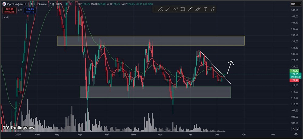 Акции преодолели трендовую линию вверх, и сейчас есть вероятность, что цена продолжит расти 🔹 Однако во второй половине дня рынок немного снизился, за исключением золотодобывающих компаний. ❗️ Если сегодня акции «Русснефти» закроются в плюсе без признаков продаж, это будет сигналом к покупке. Тогда можно будет начать работать с этой акцией. Данный материал носит информационный характер и не является индивидуальной инвестиционной рекомендацией или предложением о покупке или продаже указанной ценной бумаги. Больше новостей и анализа находятся в нашем мобильном приложение [m o n d i a r a](https://i.mondiara.com/) Скачать в [App Store](https://apps.apple.com/ru/app/m-o-n-d-i-a-r-a/id6475953453) Скачать в [Google Play](https://play.google.com/store/apps/details?id=com.mondiara.app) Источник: МБ. Обзор