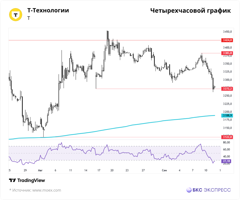 Мнение: БКС Экспресс Анализ акций компании "Т-Технологии" В четверг акции компании «Т-Технологии» потеряли в цене 1,42% и закрылись на отметке 3280 рублей. Средний объем торгов составил 8,2 миллиарда рублей. Сегодня утром акции начали расти на 0,1%. 🔸 Краткосрочная перспектива В четверг акции «Т-Технологий» подешевели на фоне умеренной торговой активности, при этом большинство российских бумаг завершили день в отрицательной зоне. Индекс МосБиржи снизился на 0,21% по итогам основной сессии и на 0,12% с учетом вечерних торгов. Акции «Т-Технологий» начали день с небольшого роста, но затем перешли к активному падению. Во второй половине дня снижение замедлилось, и бумаги немного отыграли потери. В результате сформировалась медвежья свеча с умеренной амплитудой и заметной тенью внизу, которая образовалась около уровня поддержки. Покупатели смогли выкупить просадку и удержать уровень, что является позитивным сигналом для краткосрочной перспективы. Цель на ближайшую неделю — около 3384 рублей. На часовом и четырехчасовом таймфреймах наблюдается локальная перепроданность по RSI. Индикатор развернулся вверх, что увеличивает шансы на продолжение роста. Сегодня катализатором рынка могут стать итоги заседания Центрального банка РФ. Аналитики, включая БКС, ожидают снижения ключевой ставки на 200 базисных пунктов. Этот сценарий еще не полностью учтен в рыночных котировках, поэтому после публикации решения возможен рост. Индекс МосБиржи вчера удержался от глубокой просадки и закрылся символически в минусе. Краткосрочная тенденция к росту сохраняется. 🔸 Внешний фон Индекс S&P 500 в четверг вырос на 0,85%. Фьючерс на этот индекс с утра находится около нуля. Индексы Азиатско-Тихоокеанского региона торгуются разнонаправленно. Фьючерс на нефть Brent на Мосбирже вчера снизился на 1,92%, а утром на мировых площадках нефть торгуется в минусе на 0,6%, по цене около $65,7 за баррель. Уровни сопротивления: 3383, 3424, 3685. Уровни поддержки: 3272, 3122, 2995. 🔸 Долгосрочная перспектива Долгосрочная динамика акций определяется пологим восходящим трендом, начавшимся в марте 2020 года. От исторических максимумов котировки снизились на 62%. Ближайшая среднесрочная цель — переписать максимумы 2023 года, которые находятся на уровне 3812 рублей. Это важный технический уровень, преодоление которого может ускорить рост. На недельном графике динамика умеренно позитивная. После резкого роста в начале августа акции перешли в затяжную фазу консолидации. Откат при этом имеет небольшую амплитуду и остается в рамках локальной восходящей тенденции. ❗️ Аналитики БКС оценивают перспективы акций «Т-Технологий» как «позитивные». Цель на 12 месяцев — 5400 рублей. Автор: Решетников Олег Данный материал носит информационный характер и не является индивидуальной инвестиционной рекомендацией или предложением о покупке или продаже указанной ценной бумаги. Больше новостей и анализа находятся в нашем мобильном приложении [m o n d i a r a](https://i.mondiara.com/) Скачать в [App Store](https://apps.apple.com/ru/app/m-o-n-d-i-a-r-a/id6475953453) Скачать в [Google Play](https://play.google.com/store/apps/details?id=com.mondiara.app) Источник: bcs-express.ru