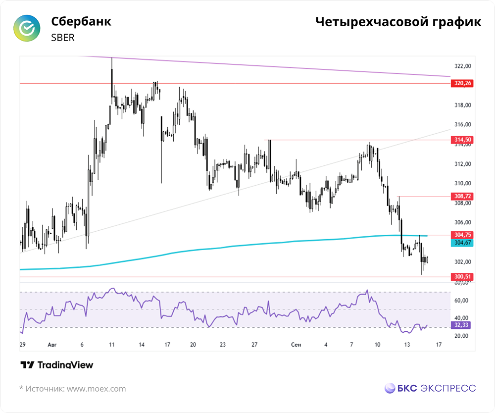 Мнение: БКС Экспресс Торговый взгляд на акции "Сбербанка" Акции Сбербанка в понедельник подешевели на 0,34% и закрылись на уровне 302,48 руб. Объем торгов был ниже среднего — 7,5 млрд руб. Утром во вторник бумаги выросли на 0,2%. 🔸 Краткосрочная картина • В понедельник акции Сбербанка немного снизились в цене, при этом объем торгов был низким. Большинство российских акций также закрылись в минусе. Индекс МосБиржи потерял 1,05% за основную сессию и закрылся на 1,03% ниже, чем в пятницу вечером. • В первой половине дня акции Сбербанка продолжали снижаться, но затем начался отскок, который позволил компенсировать большую часть потерь. • На закрытии дня сформировалась свеча с небольшим черным телом и длинной тенью внизу. • Разворот внутренней динамики произошел на уровне 300,5 руб., который считается психологически важным. В течение дня также был протестирован 200-дневный скользящий средний снизу, и акции закрепились ниже него, что является негативным сигналом. • Несмотря на вчерашние попытки отскока и состояние, близкое к перепроданности, сегодня акции могут немного вырасти и повторно протестировать 200-дневный скользящий средний. • На более широком временном горизонте ожидается продолжение нисходящего движения к уровням 291-292 руб. • Индекс МосБиржи преодолел поддержку на уровне 2820 пунктов и обновил минимумы. Это открывает путь к уровню 2720 пунктов. 🔸 Внешний фон • Индекс S&P 500 в понедельник вырос на 0,47%, а фьючерс на индекс утром в плюсе на 0,2%. Индексы стран Азиатско-Тихоокеанского региона движутся разнонаправленно. • Фьючерс на нефть Brent на Мосбирже вырос на 0,9% в понедельник, а на мировых площадках нефть с утра в плюсе на 0,2% и торгуется на уровне $67,3 за баррель. Уровни сопротивления: 304,7, 308,7, 314,5. Уровни поддержки: 300,5, 296,6, 291,7. 🔸 Долгосрочная картина • Акции Сбербанка торгуются на 22% ниже исторического максимума. В феврале 2022 года был пробит многолетний тренд, начавшийся в 2014 году. • Поддержка найдена на уровне пологого растущего тренда, идущего от минимумов 2009 года. Акции уверенно росли до середины 2024 года, после чего началась коррекция. • Снижение удалось остановить в декабре благодаря решению Центрального банка не повышать ключевую ставку. Среднесрочный тренд изменился на восходящий. Прорыв 200-дневного скользящего среднего значительно улучшил перспективы. • Ближайшие среднесрочные цели — закрепление выше долгосрочной нисходящей тенденции и обновление максимумов 2024 года на уровне 330 руб. • Прошлую неделю акции завершили негативной свечной формацией, разрушив шансы на отскок, появившиеся после предыдущего недельного закрытия. В результате ожидается снижение к уровню 300 руб. ❗️ Аналитики БКС оценивают перспективы акций Сбербанка как позитивные и прогнозируют цель на горизонте года в 400 руб. Автор: Решетников Олег Данный материал носит информационный характер и не является индивидуальной инвестиционной рекомендацией или предложением о покупке или продаже указанной ценной бумаги. Больше новостей и анализа находятся в нашем мобильном приложении [m o n d i a r a](https://i.mondiara.com/) Скачать в [App Store](https://apps.apple.com/ru/app/m-o-n-d-i-a-r-a/id6475953453) Скачать в [Google Play](https://play.google.com/store/apps/details?id=com.mondiara.app) Источник: bcs-express.ru