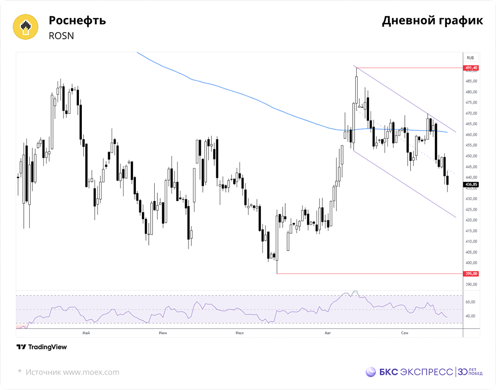 Мнение: БКС Экспресс Прогноз по акциям Роснефти Вчера акции Роснефти подешевели на 0,9%, достигнув отметки 436,85 рублей. Объем торгов составил 1,4 млрд рублей. Утром на сессии бумаги продолжили падение, снизившись на 0,48% до 434,75 рублей. 🔸 Краткосрочная перспектива Акции Роснефти продолжают нисходящее движение, обновив месячный минимум. Падение было умеренным, но сопровождалось средним объемом торгов. Триггером для распродаж стало менее значительное, чем ожидалось, снижение ключевой ставки ЦБ РФ. Это событие оказало влияние на акции компании из-за её высокой долговой нагрузки. Закрытие сессии произошло ниже 200-часовой скользящей средней. Техническая картина на краткосрочном горизонте остается умеренно негативной. Утреннее значение индекса относительной силы (RSI) указывает на близость к состоянию перепроданности. В ближайшие дни акции Роснефти могут продолжить снижение к уровню 430 рублей и ниже. Техническая поддержка может быть найдена в районе 420 рублей. 🔸 Внешний фон Индекс S&P 500 вчера снизился на 0,13%. Фьючерсы на этот индекс утром также немного падают, около 0,1%. Азиатские фондовые индексы показывают разнонаправленную динамику. Нефть Brent подешевела на 0,15% до 68,4 долларов за баррель. Уровни сопротивления: 439, 443, 448. Уровни поддержки: 430, 425, 420. 🔸 Долгосрочная перспектива С середины сентября акции Роснефти вернулись в среднюю часть диапазона 395–494 рублей. Это создает условия для замедления среднесрочного нисходящего тренда в районе 420 рублей. Акции немного опустились ниже 200-дневной скользящей средней, но это пока лишь краткосрочное движение. Долгосрочная техническая картина сохраняет нейтралитет. Автор: Манжос Виталий Данный материал носит информационный характер и не является индивидуальной инвестиционной рекомендацией или предложением о покупке или продаже указанной ценной бумаги. Больше новостей и анализа находятся в нашем мобильном приложении [m o n d i a r a](https://i.mondiara.com/) Скачать в [App Store](https://apps.apple.com/ru/app/m-o-n-d-i-a-r-a/id6475953453) Скачать в [Google Play](https://play.google.com/store/apps/details?id=com.mondiara.app) Источник: bcs-express.ru