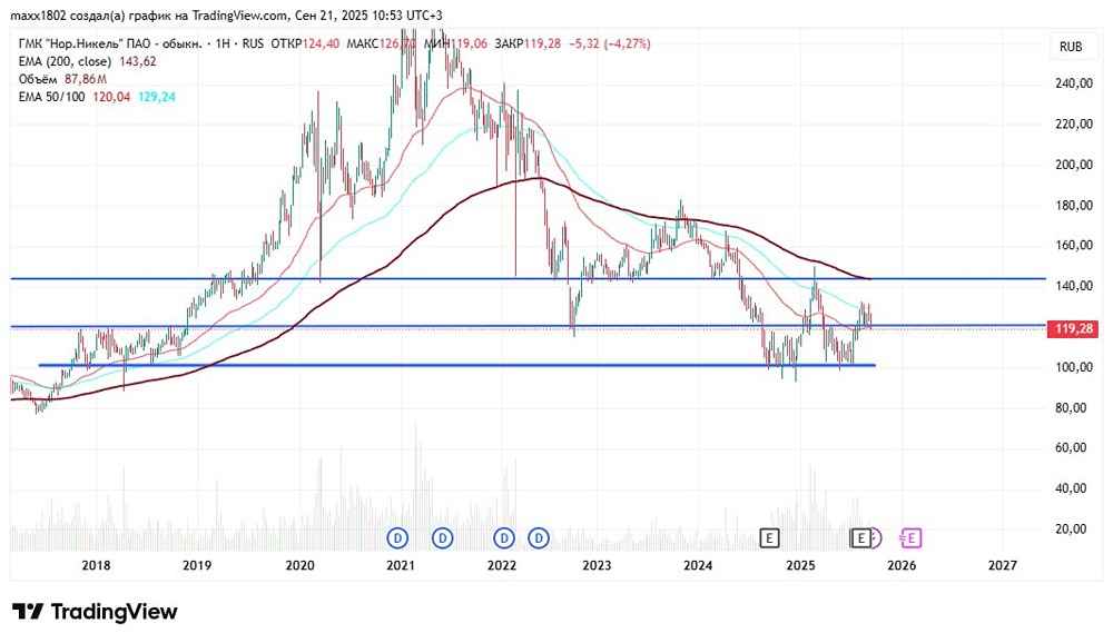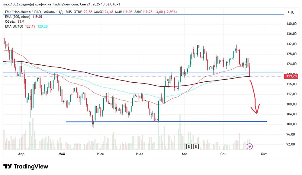 Норникель уже принёс нам прибыль Сейчас акции компании вместе с рынком упали и пробили сильный уровень поддержки. Давайте посмотрим, как на этом заработать. 🔷 Анализ графика 🔹 Дневной таймфрейм Уровень поддержки 121 прорван. Единственный уровень, который пока сдерживает цену, — это ЕМА200. Пробой ЕМА200 может отправить котировки вниз к следующему уровню поддержки — 100. Перед этим цена, вероятно, протестирует уровень 119–121. Если после теста будет разворот вниз, можно будет рассмотреть возможность продажи (шортинга) с целью 100. Если цена сразу упадёт до 100, это будет хорошей возможностью для покупки. 🔹 Недельный таймфрейм Уровень 100 — это сильный уровень. Если он будет пробит, бумагу, как правило, выкупают. При покупке или продаже обязательно следите за индексом Московской биржи. Если цена акции упадёт до уровня поддержки, а индекс также окажется на поддержке, это будет идеальным моментом для покупки. ⚡️ Записывайте компанию в свой список и внимательно следите за её движением. ❗️ Будьте осторожны! Рынок сейчас волатильный, и возможны резкие движения в любую сторону. Обязательно ставьте стоп-лоссы, чтобы защитить свои позиции. Данный материал носит информационный характер и не является индивидуальной инвестиционной рекомендацией или предложением о покупке или продаже указанной ценной бумаги. Больше новостей и анализа находятся в нашем мобильном приложение [m o n d i a r a](https://i.mondiara.com/) Скачать в [App Store](https://apps.apple.com/ru/app/m-o-n-d-i-a-r-a/id6475953453) Скачать в [Google Play](https://play.google.com/store/apps/details?id=com.mondiara.app) Источник: Инвестируем Выгодно