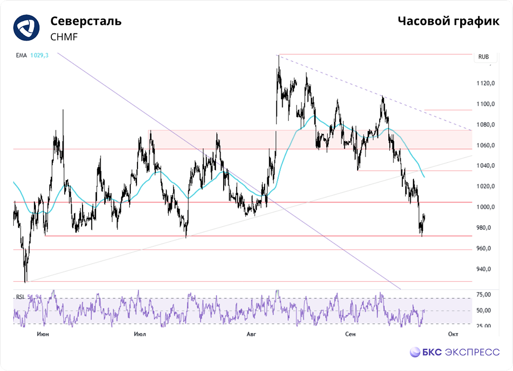 Мнение: БКС Экспресс Взгляд на акции Северстали Акции «Северстали» в понедельник, 22 сентября, выросли на 0,73%, завершив день на отметке 988 рублей. Объем торгов составил 1,2 млрд рублей. Утром котировки прибавили 0,2%, оставаясь вблизи уровня 991 рубль. 🔹 Краткосрочная ситуация • После паузы в четверг акции «Северстали» в пятницу продолжили падение ускоренными темпами. Геополитическая напряженность и неопределенность денежно-кредитной политики Центробанка привели к тому, что бумаги сталевара не удержались выше минимумов 2024 года. В понедельник были попытки опустить котировки ниже летнего минимума, но перепроданная бумага смогла отступить от этой поддержки. • Утром акции находятся в небольшом плюсе. За две недели падения техническая картина ухудшилась: локальный восходящий тренд, начавшийся от минимумов года, был сломлен, и начал формироваться нисходящий тренд по максимумам августа — сентября. Первая цель восстановления — возврат к минимумам прошлого года на уровне 1005 рублей. При достижении этой цели ориентир сместится на диапазон сопротивлений 1057–1076 рублей — от максимумов мая до пиковых значений июля. Преградой могут стать 200-часовая экспоненциальная скользящая средняя на уровне 1029 рублей и минимумы начала месяца на 1036 рублей. • Если негативная динамика возобновится, поддержкой останутся минимумы лета около 970 рублей. Чуть ниже, на уровне 958 рублей, находятся минимумы апреля, которые могут стать промежуточной преградой. Годовое дно находится на уровне 926 рублей. 🔹 Внешний фон • Индекс S&P 500 в понедельник вырос на 0,44%, но утром фьючерсы просели на 0,1%. В Азии индексы торгуются в отрицательной динамике: гонконгский Hang Seng и китайский Shanghai Composite снизились на 0,9% и 1,2% соответственно. Биржи Японии закрыты из-за выходного дня. Нефть Brent утром опустилась на 0,5% до 66,3 долларов за баррель. 🔹 Ключевые уровни Сопротивления: 1005 / 1036 / 1057 Поддержки: 970 / 958 / 926 🔹 Долгосрочная ситуация • После сильного падения в 2022 году акции «Северстали» полностью восстановились в 2024 году и к апрелю достигли максимумов, поднявшись выше 2000 рублей. От этой вершины началось снижение, и в прошлом году бумаги опустились до минимума на уровне 1005,4 рубля. • Решение Центробанка оставить ставку без изменений в декабре и перспективы урегулирования украинского конфликта позволили котировкам отскочить в текущем году до 1450 рублей. Однако весь этот рост был нивелирован: бумаги обновили минимумы 2024 года, а затем и мая 2023 года. • Техническая картина улучшилась после выхода из нисходящего тренда от максимумов прошлого года. Попытки достичь следующей цели и закрепиться выше 200-дневной скользящей средней пока не увенчались успехом. Если это удастся, среднесрочным ориентиром станет возвращение к пиковым значениям года. Однако это будет сложно, так как сталелитейная отрасль переживает непростой период. • В стратегии на IV квартал мы повысили целевую цену акций «Северстали» на 9%, до 1200 рублей, и изменили прогноз на «Нейтральный». Основные причины — снижение безрисковой ставки и ожидаемая стабилизация спроса с следующего года. При этом у компании остается крупная программа капитальных затрат, что в условиях кризиса отрасли негативно скажется на денежном потоке и приведет к отдаче только на более длинном горизонте. Автор: Попова Анастасия Данный материал носит информационный