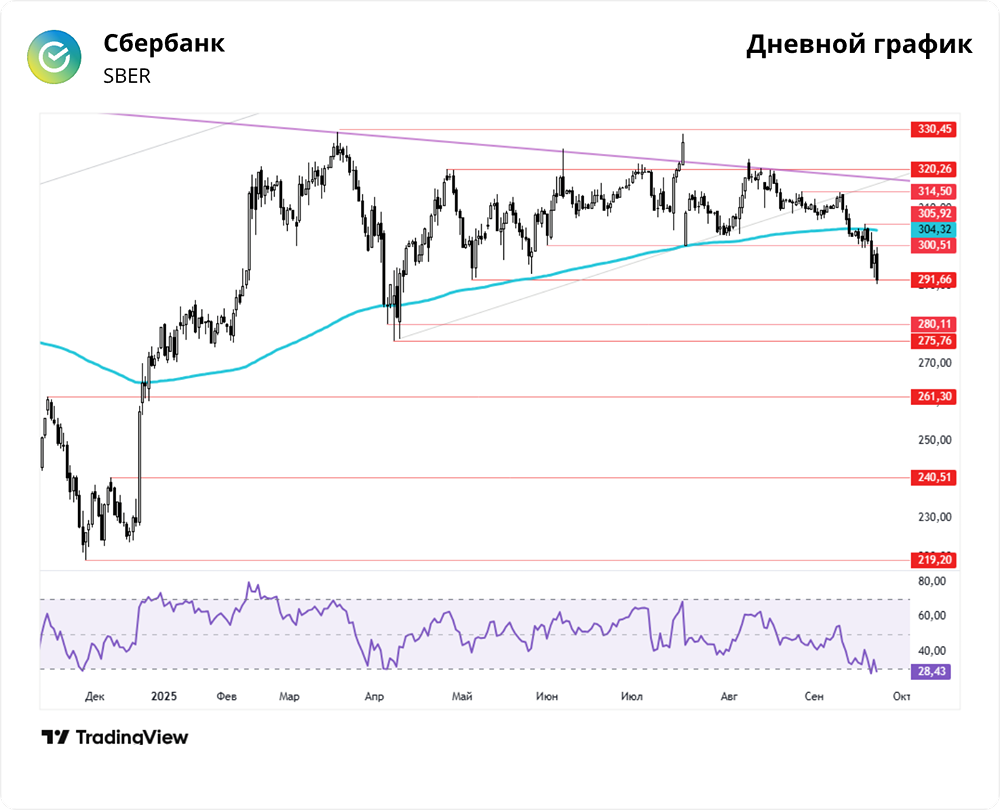 Мнение: БКС Экспресс Взгляд на акции Сбербанка Акции Сбербанка во вторник снизились на 2,16%, цена закрытия — 291,6 руб. Объем торгов средний — 10,1 млрд руб. Сегодня с утра бумаги в плюсе на 0,5% (ЕСТЬ ВИДЕО). 🔹 Краткосрочная картина • Вчера бумаги Сбера существенно снизились в цене в условиях умеренной торговой активности. Подавляющее большинство акций торговалось в нисходящей динамике. Индекс МосБиржи вырос на 0,64% за основную сессию и финишировал в минусе на 1,9% в сравнении с вечеркой понедельника. • Акции Сбербанка вчера испытали небольшую просадку на утренней сессии, но в начале основных торгов вернулись на растущую траекторию. Бумаги достигли района 300 руб., откуда затем развернулись вниз. На вечерке снижение ускорилось, котировки ушли в глубокий минус. • По итогам дня в акциях сформировалась негативная свечная формация. Видим на графике «Медвежье поглощение». Это негативный сигнал, который разворачивает краткосрочный восходящий импульс. • Как указывалось во вчерашнем обзоре, целью на отскок был уровень 300 руб. Пробить его не удалось, поэтому бумаги резко развернулись вниз. Это негативный технический сигнал. Кроме того, в ходе ускорившегося снижения были обновлены минимумы предшествующего дня. • Удержаться от пробоя уровня 291,7 руб. сразу все же удалось. Закрылись на границе. Тем не менее вероятность увидеть отскок отсюда мала, поэтому на горизонте ближайших дней снижение может продолжиться. • В Индексе МосБиржи вчера также образовалась резкая разворотная формация. По итогам дня бенчмарк закрылся ниже 2710 п. Просматривается продолжение снижения в район 2600–2620 п. 🔹 Внешний фон Индекс S&P 500 во вторник упал на 0,55%. С утра фьючерс на индекс в плюсе на 0,1%. Индексы АТР торгуются разнонаправленно. Фьючерс на Brent на Мосбирже во вторник вырос на 1,82%, на мировых площадках нефть с утра в минусе на 0,3% и находится на отметке $67. Уровни сопротивления: 300,5 / 305,9 / 314,5 Уровни поддержки: 291,7 / 280,1 / 275,8 🔹 Долгосрочная картина • Бумага торгуется на 25% ниже исторического максимума. На фоне геополитической ситуации в феврале 2022 г. был пробит многолетний тренд, берущий начало с 2014 г. • Опора найдена на уровне пологого растущего тренда, который тянется от минимумов 2009 г. Бумага уверенно росла до середины 2024 г., после чего перешла в фазу коррекции. • Остановить снижение котировок удалось в декабре. Катализатором выступило решение ЦБ не повышать ключевую ставку. Среднесрочный тренд сменился на восходящий. • Ближайшие среднесрочные цели — возврат выше 200-дневной скользящей и закрепление выше долгосрочной нисходящей трендовой от октября 2021 г. • Прошедшую неделю закрыли амплитудной черной свечой. На недельном графике пришли в зону поддержки, нижняя граница которой проходит в районе 291–292 руб. Цель текущей недели — закрытие на уровне этой поддержки или выше, чтобы избежать более глубокой коррекции. В противном случае бумаги могут снизиться в область 280 руб. ❗️ Взгляд аналитиков БКС на акции «Нейтральный», цель на горизонте года — 390 руб. Автор: Решетников Олег Данный материал носит информационный характер и не является индивидуальной инвестиционной рекомендацией или предложением о покупке или продаже указанной ценной бумаги. Больше новостей и анализа находятся в нашем мобильном приложении [m o n d i a r a](https://i.mondiara.com/) Скачать в [App Store](https://apps.apple.com/ru/app/m-o-n-d-i-a-r-a/id6