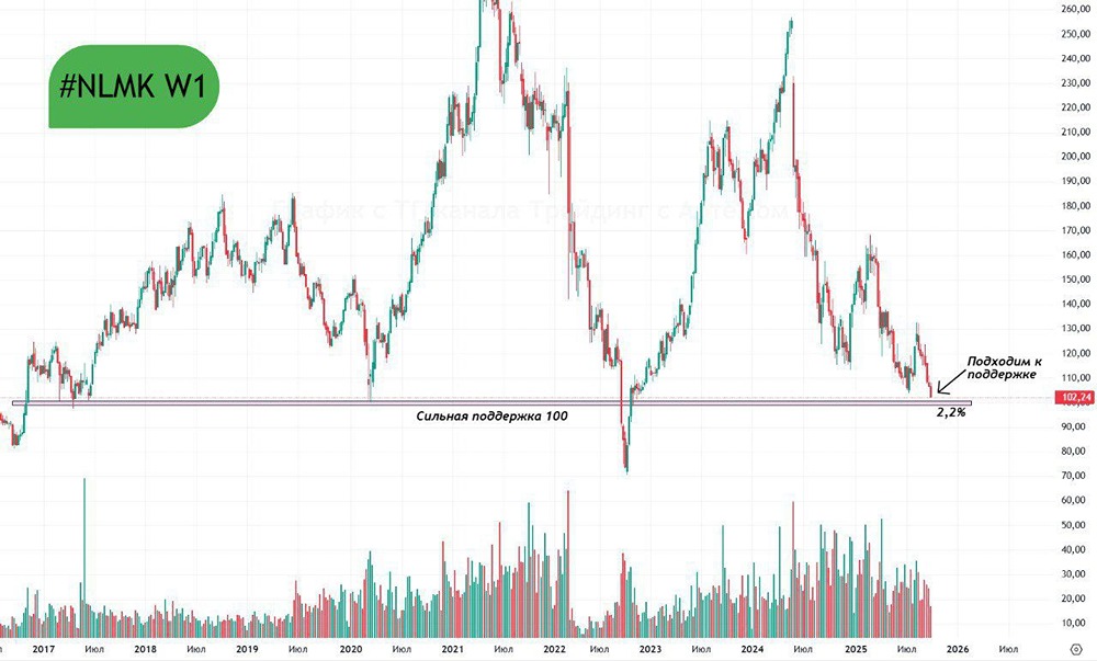 НЛМК на этой неделе вновь обновил локальные лои, и сейчас он торгуется на уровнях ноября 2022 года 🔸 Технически мы подходим к сильной поддержке, которая расположена в районе 100. 🔸 Также уровень 100 можно рассмотреть как психологическую поддержку. С текущих до неё осталось 2,2%. ❗️ Я думаю, что есть большая вероятность увидеть отскок от этой поддержки. По RSI на дневном фрейме мы торгуемся в зоне перепроданности. Данный материал носит информационный характер и не является индивидуальной инвестиционной рекомендацией или предложением о покупке или продаже указанной ценной бумаги. Больше новостей и анализа находятся в нашем мобильном приложение [m o n d i a r a](https://i.mondiara.com/) Скачать в [App Store](https://apps.apple.com/ru/app/m-o-n-d-i-a-r-a/id6475953453) Скачать в [Google Play](https://play.google.com/store/apps/details?id=com.mondiara.app) Источник: Трейдинг с Артёмом