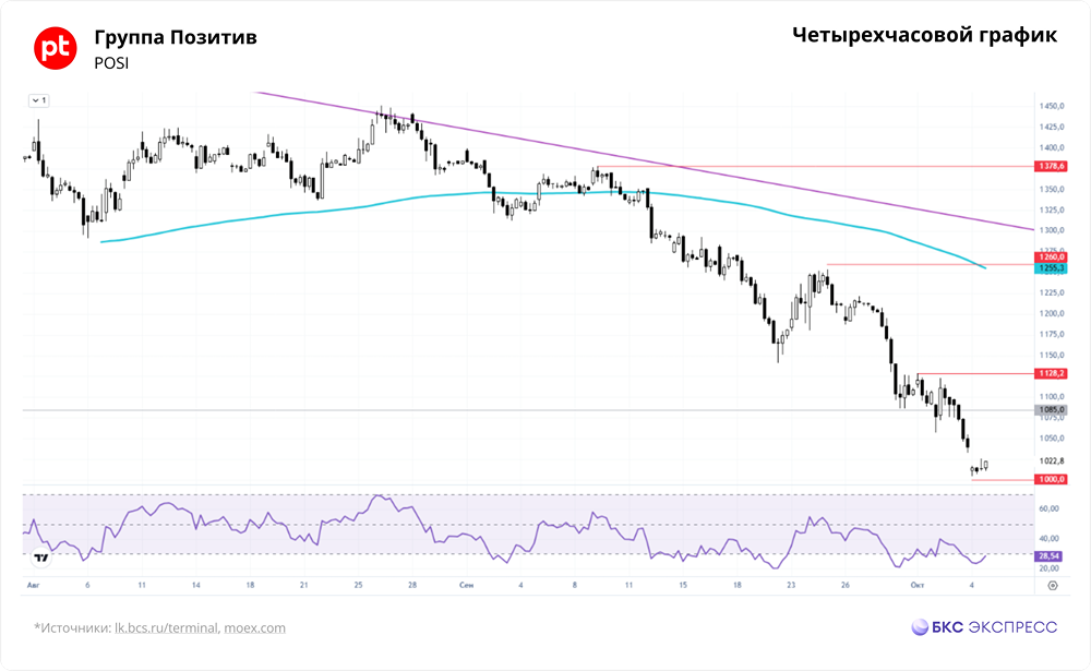 Мнение: БКС Экспресс Анализ акций Группы Позитив В пятницу акции Группы Позитив подешевели на 4,67% и закрылись на уровне 1041 руб. Торги прошли с объемом 0,44 млрд руб. В начале дня акции немного выросли — на 0,3%. 🔸 Краткосрочная перспектива • В пятницу акции Группы Позитив резко упали на фоне низкой торговой активности. Большинство российских акций также снизились. Индекс МосБиржи упал на 1,05% за основную сессию и на 1,39% с учетом вечерней. • В течение дня акции Позитива плавно снижались и закрылись вблизи внутридневных минимумов. За неделю они потеряли почти 15%. • День завершился медвежьей свечой, закрывшейся рядом с минимумами. Слабость в котировках сохраняется, и акции находятся на минимумах с октября 2022 года. • Хотя полноценных сигналов к развороту пока нет, возможен небольшой отскок для снижения перепроданности. Психологически значимая поддержка — 1000 руб. RSI на дневном графике приближается к 20. За неделю бумаги снизились на 15%, что может вызвать отложенный спрос на покупку. • Кроме того, отскок может начаться на широком рынке, так как Индекс МосБиржи достиг зеркального диапазона поддержки 2570–2600 п. В воскресенье уже были попытки роста. • Цель на отскок — 1085 руб. От этих значений можно рассмотреть повторную короткую позицию. 🔸 Внешний фон • S&P 500 вырос на 0,01%, фьючерс на индекс утром прибавил 0,3%. Индексы АТР торгуются разнонаправлено. Фьючерс на Brent на Мосбирже вырос на 0,25%, а на мировых рынках нефть подорожала на 1,3% до $65,1 за баррель. Уровни сопротивления: 1128,2 / 1260 / 1378,6 Уровни поддержки: 1000 / 951 / 837 🔸 Долгосрочная перспектива • Долгосрочная динамика акций Группы Позитив была восходящей с марта 2022 года. В конце октября 2024 года тренд был нарушен. С исторического максимума акции потеряли 68%. • Локальную поддержку акции нашли на уровне 1100 руб. После формирования «Двойного дна» они показали отскок, но устойчивая восходящая динамика не сложилась. Ситуация на рынке ухудшилась, и акции опустились до 1000 руб. • Недельный график показывает негативную техническую картину. Минимумы 2025 года были обновлены, а неделю закрыли вблизи них. Возможен локальный отскок от уровня 1000 руб., но в целом ожидается продолжение снижения к 950 руб. ❗️ Аналитики БКС дают негативный прогноз на год, предполагая цену акций в 1000 руб. Автор: Решетников Олег Данный материал носит информационный характер и не является индивидуальной инвестиционной рекомендацией или предложением о покупке или продаже указанной ценной бумаги. Больше новостей и анализа находятся в нашем мобильном приложении [m o n d i a r a](https://i.mondiara.com/) Скачать в [App Store](https://apps.apple.com/ru/app/m-o-n-d-i-a-r-a/id6475953453) Скачать в [Google Play](https://play.google.com/store/apps/details?id=com.mondiara.app) Источник: bcs-express.ru