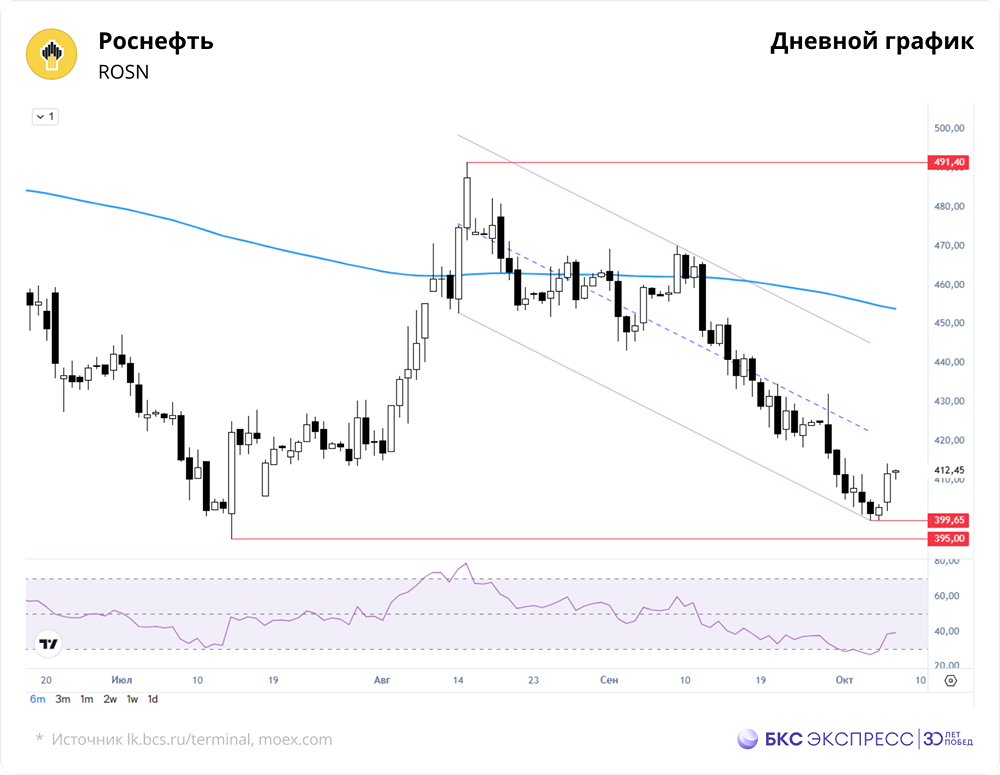 Мнение: БКС Экспресс Техническая картина по акциям Роснефти Вчера акции Роснефти выросли на 1,79%, до 411,65 руб. Торги составили 2,4 млрд руб. Утром бумаги снизились на 0,15%, до 411,05 руб. 🔸 Краткосрочная перспектива • Заметный рост акций сопровождался умеренным увеличением объема торгов. Нефтяная компания продолжила технический отскок от трехмесячного минимума. Среднесрочная поддержка находится на уровне 400 руб. На дневном графике акции восстанавливаются в центр полуторамесячного нисходящего канала. • Среднесрочная слабость акций обусловлена менее значительным, чем ожидалось, снижением ключевой ставки ЦБ РФ в сентябре 2025 года. Это чувствительно для компании из-за высокой долговой нагрузки. • Цена закрытия опустилась ниже 200-часовой скользящей средней, но в течение дня сформировалась позитивная техническая картина. Высокий утренний уровень RSI на часовом графике указывает на приближение к состоянию перекупленности. • В ближайшие дни акции Роснефти, вероятно, продолжат технический отскок от свежего минимума. Сопротивление находится на уровне 415 руб. Уверенный прорыв этой отметки станет сигналом для дальнейшего роста. 🔸 Внешний фон • Индекс S&P 500 вырос на 0,36%. Фьючерсы на S&P 500 сегодня снижаются на 0,1%. Азиатские фондовые рынки закрыты из-за праздников. Нефть Brent подорожала на 0,1%, до $65,5 за баррель. Уровни сопротивления: 415, 418, 423 Уровни поддержки: 408, 404, 400 🔸 Долгосрочная перспектива • К началу октября акции Роснефти опустились в нижнюю часть пятимесячного диапазона 395–492 руб. Это создает условия для остановки среднесрочного нисходящего тренда в районе 400 руб. • Акции снизились ниже 200-дневной скользящей средней — это пока среднесрочное движение. Долгосрочная техническая картина остается нейтральной. ❗️ Аналитики БКС прогнозируют цену акций Роснефти на уровне 670 руб. через год, что предполагает рост на 63% от текущих значений. Автор: Манжос Виталий Данный материал носит информационный характер и не является индивидуальной инвестиционной рекомендацией или предложением о покупке или продаже указанной ценной бумаги. Больше новостей и анализа находятся в нашем мобильном приложении [m o n d i a r a](https://i.mondiara.com/) Скачать в [App Store](https://apps.apple.com/ru/app/m-o-n-d-i-a-r-a/id6475953453) Скачать в [Google Play](https://play.google.com/store/apps/details?id=com.mondiara.app) Источник: bcs-express.ru