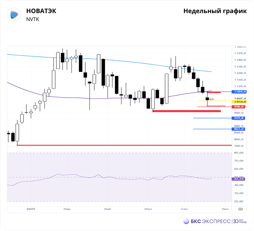 Мнение: БКС Экспресс Прогноз по акциям НОВАТЭКа Акции НОВАТЭКа упали на 1,99% в прошлую пятницу, завершив день на уровне 1035,6 рубля. Торговая сессия прошла хуже рынка, объем сделок достиг 2,56 млрд рублей. 🔸 Краткосрочные перспективы • В четверг акции опустились до минимума 1002,4 рубля. Дневной график указывает на возможное дальнейшее снижение в диапазон 973–963 рублей. Пока сопротивление на уровне 1067,2 не пробито, инициатива остается за продавцами. • Риски отскока увеличиваются. Если продавцы не удержат цену ниже 1002,4 рубля в ближайшее время, возможен пробой сопротивления 1088,4 рублей. Триггером роста может стать пробой уровня 1067,2. • RSI дневного графика на уровне 37 пунктов, что указывает на перепроданность. На 4-часовом таймфрейме акции ниже 50-дневной и 200-дневной скользящих средних. Основное внимание — уровни 1088,4 и 1002,4 рубля. 🔸 Внешний фон • Индекс S&P 500 снизился на 2,71% в пятницу, но к утру вырос на 1,2%. Азиатские индексы в красной зоне. Нефть Brent упала на 3,82% в пятницу, утром поднялась на 1,4%. Уровни сопротивления: 1067,2 / 1088,4 / 1154,4 Уровни поддержки: 1020,2 / 1002,4 / 966,6 🔸 Долгосрочные перспективы • На недельном графике акции в зоне падения 1089–1034 рублей. Закрепиться ниже 998 не удалось. • На этой неделе важно следить за ускорением падения, если недельная свеча закроется ниже 998. Это откроет путь к зоне 930–863 рублей. Первыми признаками разворота может стать пробой сопротивления 1088,4. • Текущие цели зависят от краткосрочной динамики. • В долгосрочной перспективе важно следить за закрытием недельной свечи в пятницу. • Наш взгляд на акции НОВАТЭКа остается позитивным. P/E от ожидаемой прибыли на 2025 год — 9,9х, это близко к историческому среднему 10,1х. • Дата закрытия реестра на дивиденды — 6 октября 2025 года. Дивиденд на акцию — 35,5 рубля, доходность — 3,2%. • Мы ожидаем, что проект «Арктик СПГ-2» добавит до 20 рублей на акцию в дивиденды НОВАТЭКа за 2026 год. Общая выплата за год — около 82 рублей. НОВАТЭК работает над проектами «Мурманский СПГ» и «Обский СПГ», но решения пока не приняты. Автор: Мамонтов Андрей Данный материал носит информационный характер и не является индивидуальной инвестиционной рекомендацией или предложением о покупке или продаже указанной ценной бумаги. Больше новостей и анализа находятся в нашем мобильном приложении [m o n d i a r a](https://i.mondiara.com/) в канале: https://i.mondiara.com/i/c/novatek_analytics Скачать в [App Store](https://apps.apple.com/ru/app/m-o-n-d-i-a-r-a/id6475953453) Скачать в [Google Play](https://play.google.com/store/apps/details?id=com.mondiara.app) Источник: bcs-express.ru