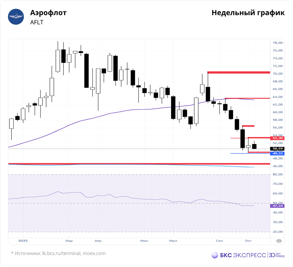 Мнение: БКС Экспресс Прогноз по акциям Аэрофлота На прошлой торговой сессии акции Аэрофлота потеряли 2,04%, закрывшись на уровне 50,97 руб. Они отставали от рынка. Объем торгов составил 0,71 млрд руб. 🔸 Краткосрочная перспектива • На дневном графике образовались цели снижения: 48,46 и 47,84. Эти уровни актуальны, пока цена не пробьет сопротивление на 53,54. Текущий минимум — 49,57. • Ждем пробоя поддержки на 49,57 в ближайшие дни, чтобы продолжить снижение и достичь целей дневного и недельного графиков. • На дневном таймфрейме RSI находится на уровне 34 п. На 4-часовом графике акции ниже 50-дневной и 200-дневной скользящих средних. Основное внимание уделяем уровням сопротивления и поддержки: 56,6 и 49,57. 🔸 Внешний фон • Индекс S&P 500 во вторник снизился на 0,12%, утром был в плюсе на 0,3%. Азиатские индексы растут. Нефть Brent во вторник упала на 1,47%, утром подешевела на 0,2%. Уровни сопротивления: 52,58 / 53,54 / 56,6 Уровни поддержки: 50,36 / 49,57 / 46,5 🔸 Долгосрочная перспектива • На недельном графике сформировались цели снижения: 56,98, 54,56 и 53,3. Цена закрепилась ниже 53,3, ускорившись к цели 49,33. Сценарий продолжения падения актуален, пока не будет сломлен уровень сопротивления 56,6. • В долгосрочной перспективе важно следить за закрытием недельной свечи в конце торгов пятницы. 🔸 Фундаментальные показатели • Аэрофлот представил слабые операционные данные за сентябрь: пассажиропоток упал на 5,7% до 5 млн человек, пассажирооборот снизился на 1,3%. • На международных направлениях зафиксирован рост, что говорит о сохранении спроса. На внутренних рейсах наблюдается значительное снижение. Средние ставки на международных рейсах обычно выше, поэтому говорить о негативном влиянии на выручку пока рано. • Аэрофлот стремится активнее монетизировать международный трафик. Также отмечено снижение налета по парку (-1,5%) и сокращение рейсов на внутренних линиях. Возможно, это связано с экономией ресурса самолетов. Пока ситуация не критична, а скорее нейтральна. • Операционные данные за III квартал продолжают показывать замедление внутреннего трафика. Важны тренды стоимости среднего билета и динамика издержек. ❗️ Сохраняем «негативный» взгляд на компанию. Акция на текущих уровнях кажется переоцененной. Однако в условиях геополитической неопределенности возможны резкие колебания. Положительными факторами могут стать открытие новых южных аэропортов, возобновление авиасообщения с США и другие события. Автор: Мамонтов Андрей Не является индивидуальной инвестиционной рекомендацией Интересуют конкретные акции или сектора❓ А может новости или тренды на фондовом рынке❓ Или не знаете, «что купить» и «когда продать»❓ Тогда Вам в нашу экосистему 🤝 Подпишитесь на нужные каналы в [M O N D I A R A](https://i.mondiara.com/) и получайте только ту информацию, которая важна именно Вам❗️ 👉 вот ссылка на канал от куда новость, с которой Вы ознакомились: https://i.mondiara.com/i/c/aeroflot_analytics А, чтобы мы всегда были рядом скачай приложение уже сейчас и убедитесь в его эффективности! Валюта расчёта - Ваши добрые мысли! Спасибо, что с нами! [Скачать](https://apps.apple.com/ru/app/m-o-n-d-i-a-r-a/id6475953453), если у Вас айфон: [App Store](https://apps.apple.com/ru/app/m-o-n-d-i-a-r-a/id6475953453) [Скачать](https://play.google.com/store/apps/details?id=com.mondiara.app), если не любите яблоки [Google Play](https://play.google.com/store/apps/details?id=com.mondiara.app) Источник: bcs-express.ru