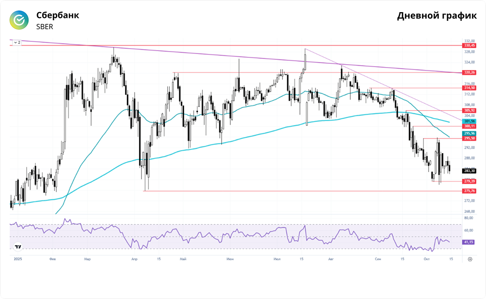 Мнение: БКС Экспресс Аналитика по акциям Сбербанка Акции Сбербанка во вторник подешевели на 0,73% и закрылись на уровне 283,3 рубля. Объем торгов был ниже обычного — 6,3 млрд рублей. Сегодня утром цена вернулась к прежнему уровню (есть видео). 🔸 Краткосрочно • Во вторник акции Сбербанка снизились на фоне низкой торговой активности. Большинство российских бумаг также подешевели. Индекс МосБиржи упал на 1,35% в основной сессии и на 1,44% к закрытию. • Акции Сбербанка снижались медленно весь день. • В итоге образовалась небольшая черная свеча с тенями вверху и внизу. Она не влияет на общую картину. • Пока нет признаков начала роста рынков, динамика стабилизировалась. На этой неделе, вероятно, акции Сбербанка будут колебаться в диапазоне 279,1–295,5 рубля. • Активные покупки начинаются при снижении цены ниже 282 рублей, а продажи — выше 294 рублей. • Индекс МосБиржи показал чуть более слабое снижение — самое низкое закрытие с 19 декабря 2024 года. Локальные минимумы не обновились. В предыдущие дни на этих уровнях покупатели включались, но вчера этого не произошло. 🔸 Внешний фон • Индекс S&P 500 во вторник снизился на 0,16%. Фьючерс на индекс утром в плюсе на 0,4%. Индексы Азиатско-Тихоокеанского региона растут. Фьючерс на Brent на Мосбирже упал на 1,79%, на мировых площадках нефть утром в минусе на 0,2%, торгуется на уровне $62. Уровни сопротивления: 295,5 / 300,1 / 305,9 Уровни поддержки: 279,4 / 275,8 / 261,3 🔸 Долгосрочно • Акции торгуются на 27% ниже исторического максимума. В феврале 2022 года был пробит многолетний восходящий тренд, начавшийся в 2014 году. • Упор сделан на уровень пологого растущего тренда, берущего начало от минимумов 2009 года. До середины 2024 года бумага уверенно росла, затем началась коррекция. • Снижение удалось остановить в декабре. Решение ЦБ не повышать ключевую ставку стало катализатором. Среднесрочный тренд изменился на восходящий. • Ближайшие цели — возврат выше 200-дневной скользящей средней и закрепление выше долгосрочной нисходящей линии от октября 2021 года. • Акции впервые за девять недель закрылись с ростом. Свеча имеет тень сверху, что указывает на давление продавцов и сохраняющуюся слабость. Тем не менее, локальное дно обозначено, и снижение возможно только при новых негативных сигналах. • Аналитики БКС оценивают акции как «нейтральные», целевая цена на год — 370 рублей. Автор: Решетников Олег Не является индивидуальной инвестиционной рекомендацией Интересуют конкретные акции или сектора❓ А может новости или тренды на фондовом рынке❓ Или не знаете, «что купить» и «когда продать»❓ Тогда Вам в нашу экосистему 🤝 Подпишитесь на нужные каналы в [M O N D I A R A](https://i.mondiara.com/) и получайте только ту информацию, которая важна именно Вам❗️ 👉 вот ссылка на канал от куда новость, с которой Вы ознакомились: https://i.mondiara.com/i/c/sberbank_analytics А, чтобы мы всегда были рядом скачай приложение уже сейчас и убедитесь в его эффективности! Валюта расчёта - Ваши добрые мысли! Спасибо, что с нами! [Скачать](https://apps.apple.com/ru/app/m-o-n-d-i-a-r-a/id6475953453), если у Вас айфон: [App Store](https://apps.apple.com/ru/app/m-o-n-d-i-a-r-a/id6475953453) [Скачать](https://play.google.com/store/apps/details?id=com.mondiara.app), если не любите яблоки [Google Play](https://play.google.com/store/apps/details?id=com.mondiara.app) Источник: bcs-express.ru