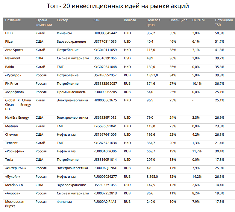 Мнение: Финам. Топ-20 инвестиционных идей от Финама. Рекордные финансовые результаты «Русагро» за 2023 год и позитивные прогнозы по урожайности в этом году подтверждают сильный инвестиционный профиль компании. Будущим драйвером роста «Русагро» станутредомициляция и выплата дивидендов за 2023 год с потенциальной доходностью около 13%. В 2024 году Fix Price на фоне высоких темпов расширения сети и частичного восстановления LFL-метрик может перейти к двузначному темпу роста основных финансовых показателей. После завершения редомициляции в Казахстаножидаем возобновления регулярных дивидендных выплат. Дивидендная доходность по итогам 2024 года в случае выплаты 100% скорр. FCF может превысить 12%. В 2023 году авиакомпания «Аэрофлот» отметила рост пассажиропотока на 16,3% по сравнению с предыдущим годом, достигнув отметки в 47,3 млн человек, а в период январь-февраль 2024 года наблюдалось увеличение на 22% (г/г). Финансовые результаты «Аэрофлота» за 2023 год также показали значительный подъем: выручка компании увеличилась на 48,1% до 612,2 млрд руб., а чистая прибыль составила 10,3 млрд руб. (против убытка в 41,5 млрд руб. в 2022 году). По прогнозу ГТЛК, в 2024 году объем пассажиропотока в РФ достигнет 114 млн чел. (+8% (г/г)). Улучшения в операционной деятельности сектора могут способствовать росту акций «Аэрофлота». «Роснефть» выделяется в секторе наличием масштабного проекта развития «Восток Ойл» и потенциалом по снижению долговой нагрузки. Кроме того, нефтяник выплачивает неплохие дивиденды — доходность на горизонте 12 месяцев, по нашим оценкам, может составить 11,6%. «Интер РАО» остается стабильным защитным бизнесом с регулярными выплатами для акционеров: совет директоров уже рекомендовал выплатить дивиденды за 2023 год в размере 0,326 руб. на акцию, а дивдоходность может составить около 8%. Другим драйвером может статьстабильный рост финансовых показателей компании. «Интер РАО» успешно расширяет производственные мощности и выигрывает от индексации тарифов на электроэнергию. Потеря же европейского экспортного рынка оказалось не такой страшной, и компания уже активно наращивает поставки в восточном направлении. По нашим оценкам, дивидендная доходность «Лукойла» на горизонте 12 месяцев может составить 14,2% — одно из наиболее высоких значений на рынке. Кроме того, «Лукойл» накопил почти 1,2 трлн руб. денежных средств, что соответствует 22% от текущей капитализации компании. На наш взгляд, это может говорить о том, что нефтяник все еще рассчитывает провести хотя бы частичный выкуп акций у нерезидентов с дисконтом. Хотя компания оказалась под всеми возможными санкциями, мы считаем, что все санкционные риски «Алросы» уже практически реализованы, и в дальнейшем положение компании будет улучшаться по мере адаптации к сложившимся условиям работы. Ожидаем роста выручки и прибыли в 2024 году. Возобновление выплаты дивидендов также окажет поддержку акциям. На фоне быстрого восстановления российского фондового рынка Московская биржа продемонстрировала рекордные операционные и финансовые показатели по итогам 2023 года. Мы ожидаем, что благодаря дальнейшему увеличению базы инвесторов, расширению спектра торгуемых инструментов, в том числе за счет новых IPO, сохранению повышенных процентных ставок, развитию портала «Финуслуги» бизнес компании продолжит уверенно смотреться в 2024 году и 