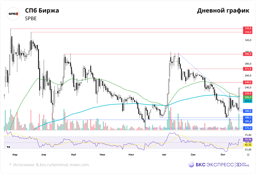 Мнение: БКС Экспресс Прогноз по акция СПБ Биржи Акции СПБ Биржи подскочили на 17,97% в четверг, достигнув 239,6 руб. Объем торгов вырос до 6,4 млрд руб. 🔸 Краткосрочная динамика • Акции возглавили рынок на фоне улучшения геополитической ситуации. Бумаги индекса МосБиржи закрылись в плюсе. Индекс вырос на 2,46% в основной сессии и на 6,97% на вечерних торгах по сравнению со средой. • В начале октября весь рост, вызванный встречей президентов США и России в Анкоридже, был потерян. Затем последовала попытка разворота, которая позволила временно отдалиться от августовских минимумов. Однако нисходящее движение быстро возобновилось. Позитивные сигналы на внешнем контуре привели к лучшему дневному результату с февраля 2025 года. • Акции приостановили падение около 189,2 руб., где наблюдался повышенный интерес покупателей. После приближения к августовскому нисходящему тренду рост замедлился. На вчерашних торгах котировки подошли к 200 руб., а затем резко пошли вверх. По итогам дня бумаги закрылись вблизи дневного максимума, преодолев ближайшее сопротивление и 200-дневную скользящую среднюю. • Объем торгов вырос почти в 8 раз по сравнению со средой. Более 90% оборота пришлось на вторую половину дня и вечернюю сессию. Ожидание геополитической оттепели вызвало всплеск спекулятивного спроса. В аналогичном случае акции выросли до 300 руб. за две недели. • Резкое улучшение настроений было вызвано очередным телефонным разговором лидеров США и России. В беседе были достигнуты договоренности о скорой встрече советников на высшем уровне. Также обсуждалась возможность встречи президентов в Будапеште. Позитивный тон Трампа и подтверждение диалога со стороны России перевесили негативный фон от крепкого рубля и дешевеющей нефти. • RSI приближается к зоне перекупленности. Акции торгуются выше 200-дневной скользящей средней на всех таймфреймах. 🔸 Внешний фон В четверг S&P 500 упал на 0,63%. Утром фьючерс на S&P 500 снизился на 0,3%. Индексы Азиатско-Тихоокеанского региона торгуются преимущественно в минусе. На мировых рынках нефть Brent дешевеет на 0,3% до $60,9 за баррель. Уровни сопротивления: 249, 272, 297 Уровни поддержки: 224, 201, 189 🔸 Долгосрочная перспектива • Акции торгуются значительно ниже цены IPO — $11,5 (834,9 руб. по курсу ЦБ РФ на 19 октября 2021 года). С момента листинга до августа 2022 года бумаги резко падали, достигнув 80,8 руб. за акцию. Ограничения на торговлю иностранными акциями сыграли ключевую роль в падении. В ноябре 2023 года был обновлен исторический минимум — 63,8 руб. • В феврале 2025 года акции импульсно выросли, пробив восходящий канал, который формировался более года. Рост был вызван спекулятивным спросом на фоне ожиданий геополитической оттепели. Однако к концу июля эффект угас, и котировки вернулись ниже 200 руб. • В августе 2025 года возобновились признаки улучшения отношений России на международной арене, что позволило бумагам подняться до 300 руб. Охлаждение дипломатических отношений привело к возврату ниже 200 руб. • Сейчас наблюдается новая волна позитивного геополитического фона, которая может стать третьей попыткой тестирования уровня 300 руб. с апреля 2025 года. Автор: Смирнов Андрей Не является индивидуальной инвестиционной рекомендацией Интересуют конкретные акции или сектора❓ А может новости или тренды на фондовом рынке❓ Или не знаете, «что купить» и «когда продат