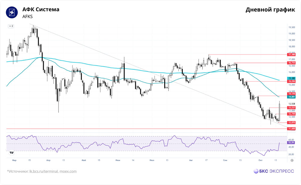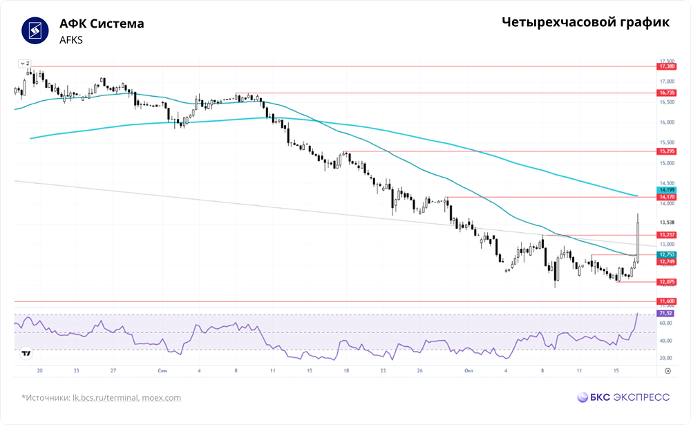 Мнение: БКС Экспресс Взгляд на акции АФК Система Акции АФК «Система» в четверг выросли на 10,7%, до 13,538 рубля. Объем торгов достиг 2,15 млрд рублей. Утром в пятницу котировки снижаются на 0,6%. Краткосрочная перспектива В четверг акции АФК «Система» резко выросли на фоне высокой торговой активности. Российский рынок акций также продемонстрировал уверенный рост: индекс МосБиржи прибавил 2,46% за основную сессию и 6,97% с учетом вечерней сессии. Утром акции компании немного снизились, но затем начали уверенно расти. Особенно сильный рост наблюдался во второй половине дня. Основной причиной стало улучшение геополитической обстановки: сначала появились сообщения о переговорах между президентами России и США, а затем стало известно об их успешном завершении. Важно отметить, что подобные резкие подъемы на рынке уже случались ранее. Поэтому пока не стоит придавать большое значение итогам вчерашних переговоров, так как они еще не закреплены на бумаге. День завершился бычьей свечой, что указывает на продолжение роста. Однако более важным фактором является общий рост рынка. Это повышает вероятность того, что позитивный настрой сохранится и сегодня. Сегодня в центре внимания снова геополитика — ожидается встреча президентов Трампа и Зеленского. Основная цель роста акций АФК «Система» — 14,17 рубля. Поддержка находится на уровне 13,24 рубля. Индекс МосБиржи также показал сильный рост, увеличившись за день на 2,46%. Повысились все бумаги, входящие в его состав. Оживление рынка заметно и по объемам торгов. Внешний фон Индекс S&P 500 в четверг снизился на 0,63%, фьючерсы на него утром также в минусе — на 0,5%. Индексы Азиатско-Тихоокеанского региона (АТР) падают. Фьючерсы на нефть Brent на Мосбирже потеряли 2,03%, а на мировых рынках — 0,2%. Цена нефти составляет $60,7 за баррель. Уровни сопротивления: 14,17, 15,3, 16,73 Уровни поддержки: 13,24, 12,75, 12,07 Долгосрочная перспектива Акции АФК «Система» движутся в рамках глобального восходящего тренда, начавшегося осенью 2008 года. Еще один важный тренд — с декабря 2014 года, который поддерживал котировки в 2018 и 2022 годах. В 2024 году акции не достигли этого уровня. С июля 2014 года наблюдается долгосрочный нисходящий тренд: с исторического максимума бумаги потеряли 72%. Однако тренд от мая 2024 года был сломлен, что улучшает перспективы восстановления акций в среднесрочной перспективе. До недавнего времени картина на недельных свечах выглядела пессимистично, но появились признаки замедления снижения. После четырех недель падения закрылись свечи «Доджи», что указывает на замедление снижения и в других бумагах. Следим за текущей динамикой. Аналитики БКС оценивают акции АФК «Система» как «нейтральные». Целевая цена на горизонте 12 месяцев — 19 рублей. Автор: Решетников Олег Не является индивидуальной инвестиционной рекомендацией Интересуют конкретные акции или сектора❓ А может новости или тренды на фондовом рынке❓ Или не знаете, «что купить» и «когда продать»❓ Тогда Вам в нашу экосистему 🤝 Подпишитесь на нужные каналы в [M O N D I A R A](https://i.mondiara.com/) и получайте только ту информацию, которая важна именно Вам❗️ 👉 вот ссылка на канал от куда новость, с которой Вы ознакомились: https://i.mondiara.com/i/c/afk_sistema_analytics А, чтобы мы всегда были рядом скачай приложение уже сейчас и убедитесь в его эффективности! Валюта расчёта - Ваши добрые мысли! Спасибо, что с нами! [Скач